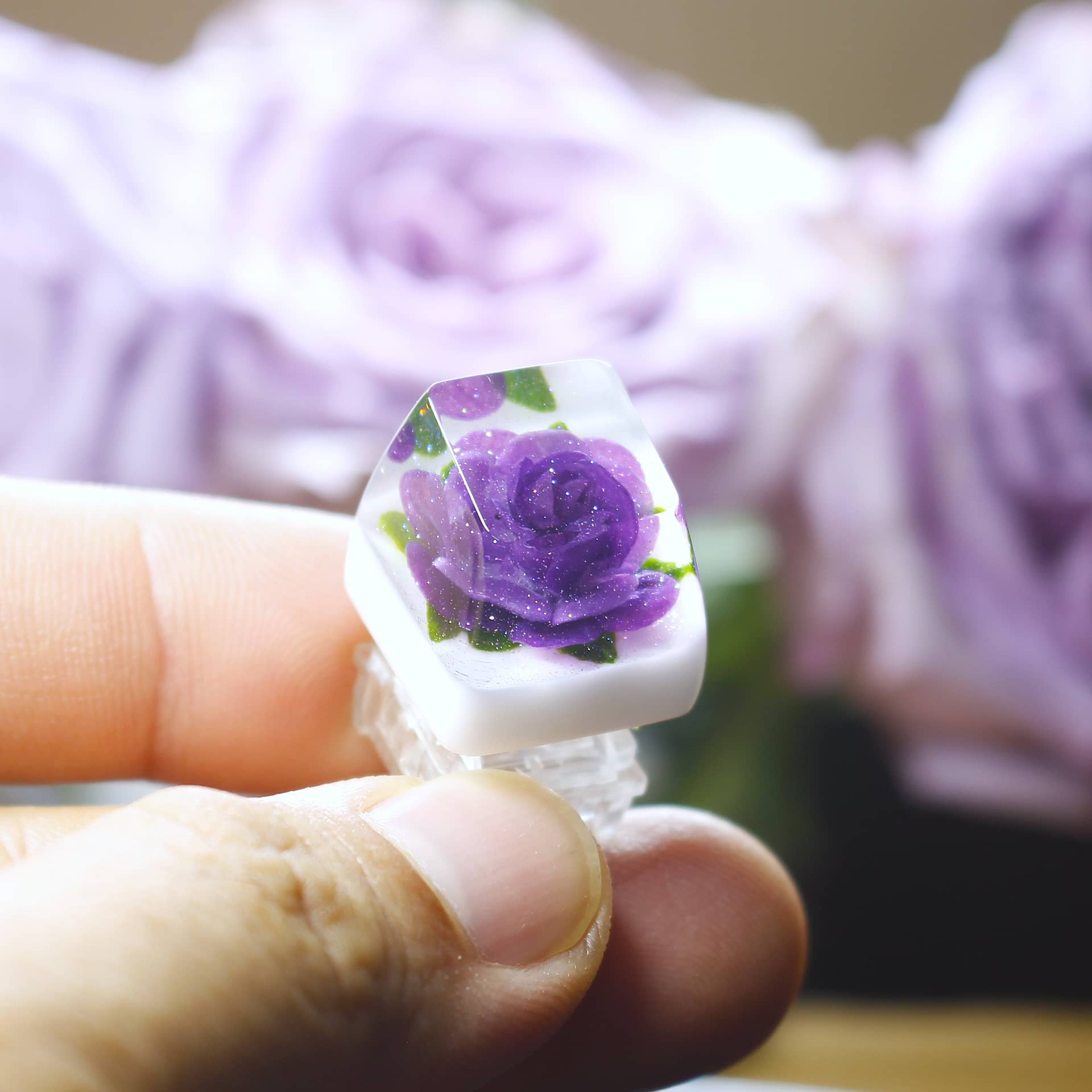A handcrafted artisan keycap featuring a miniature purple rose preserved within crystal-clear resin, inspired by the quiet beauty of Antarctica. Each flower is carefully cast by hand, then individually shaped and refined to achieve a comfortable typing profile. The edges are meticulously sanded and polished, revealing a smooth finish and elegant depth from every angle. A small collectible piece where craftsmanship meets frozen elegance.
