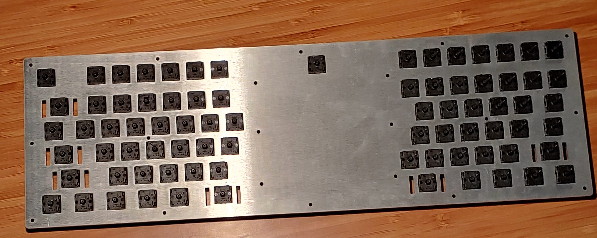 Here’s the somewhat end result. Still want decent keycaps, and I’m not sure how I’m going to finish the case (complete sandwich or standoffs with bottom acrylic plate). Right now I’m working on the QMK configuration and making sure that a split board is for me as a daily keyboard.