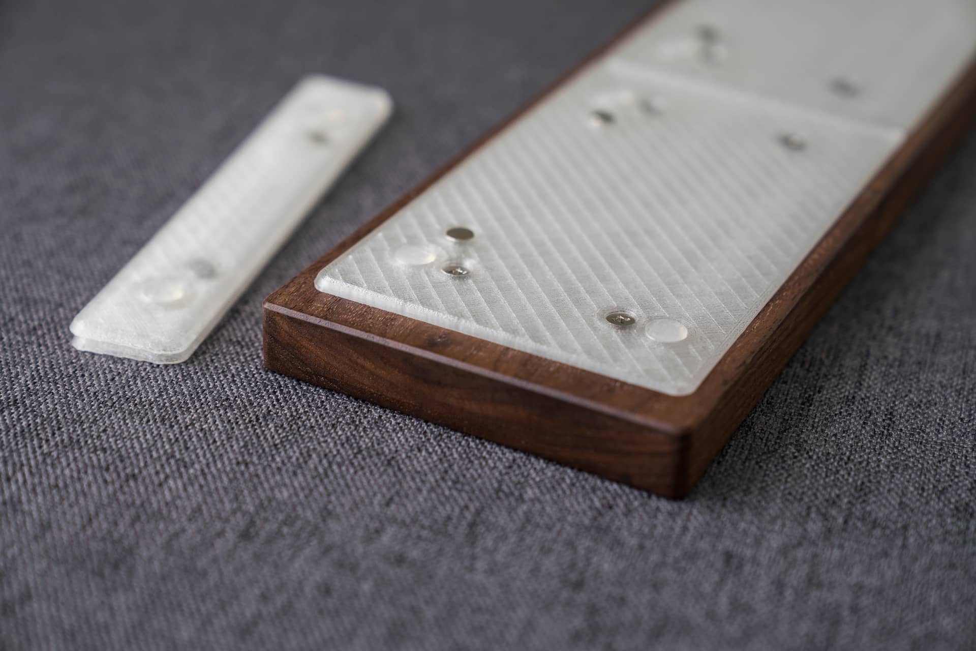 They’re simple box-on-wedge, with cross-grain hardwood on 3D printed PETG wedges. They use standard sized silicon bump-ons and have silicone strips on the back to prevent direct contact with your keyboard.