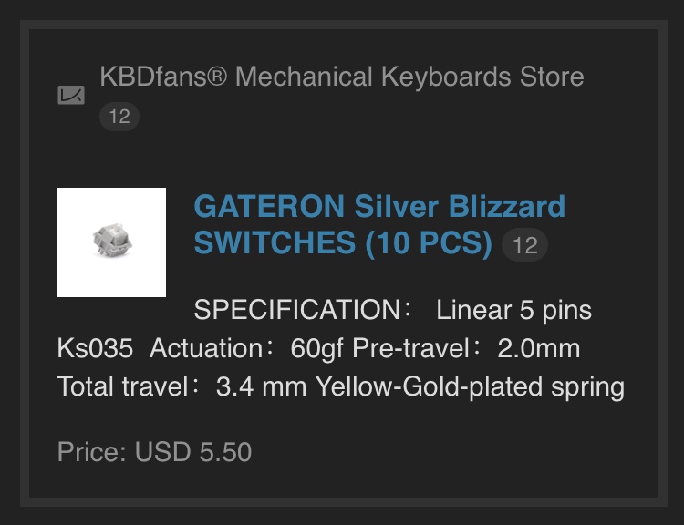 I can’t for the life of me remember which vendor at the moment, but somebody is running a “Gundam-themed” all-white switch that’s a long-pole linear, if you’re in the market.