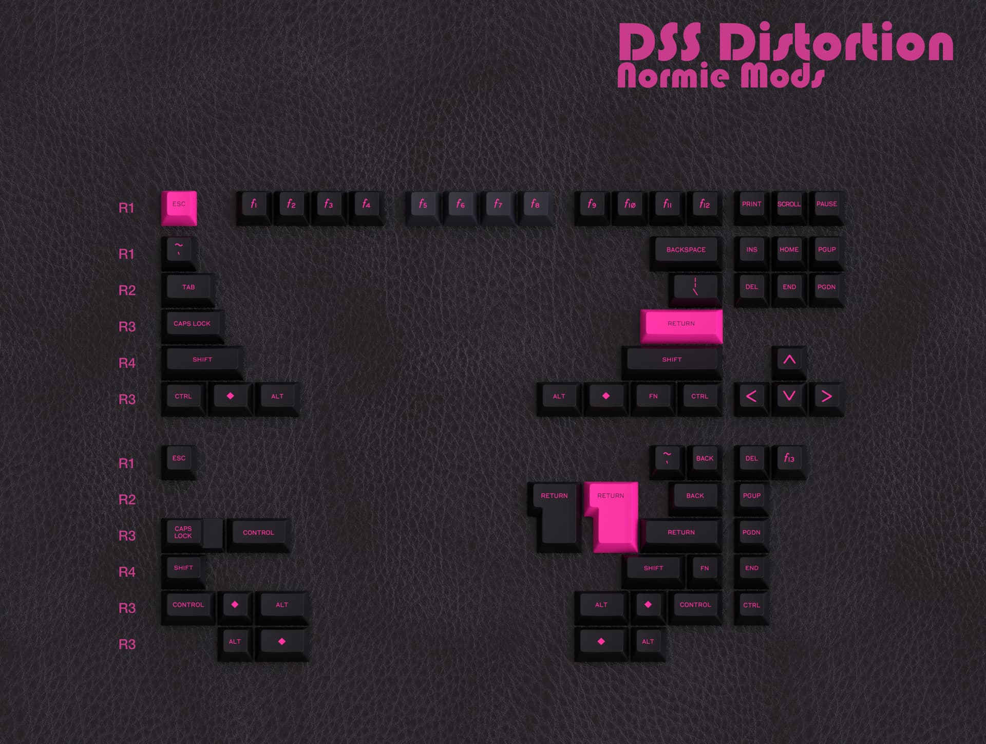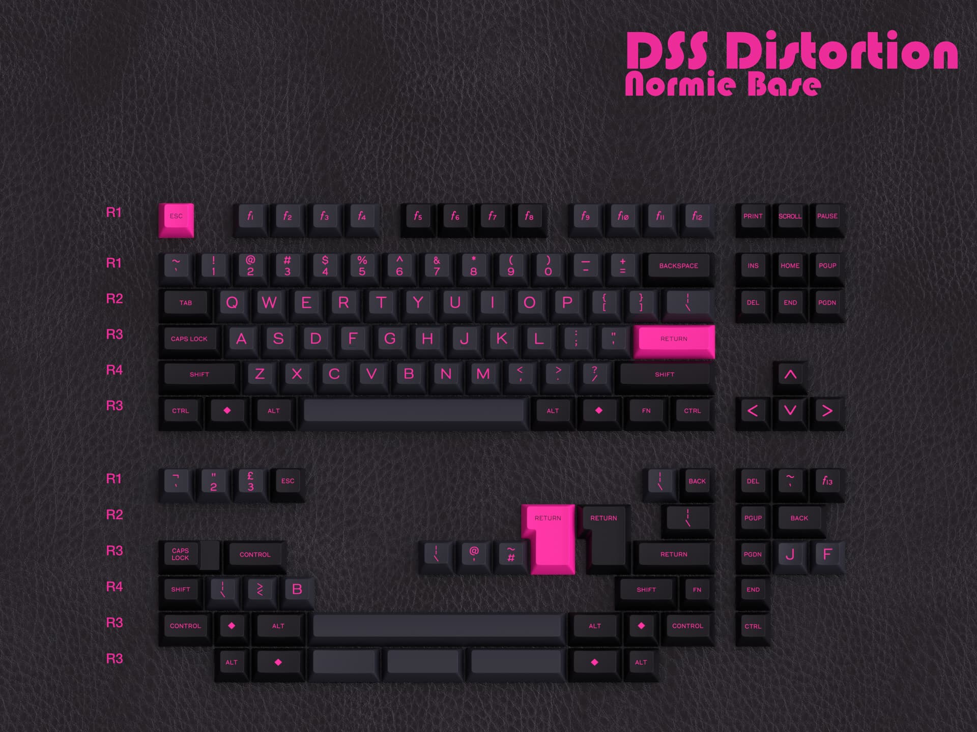 I have always admired the fashion style associated with punk and post-punk. I also think there is space for a set using a very vibrant pink. This set has undergone numerous incarnations, beginning as an SA set and later spending time in the Cherry profile. Recently, I have become interested in designing a DSS set, having tried it on many 40s keyboards at meetups, and find the height and sculpted spherical profile agreeable. So, this became a DSS set, mainly because the SP stock colors really pop, and I am tired of people telling me SA is too tall.