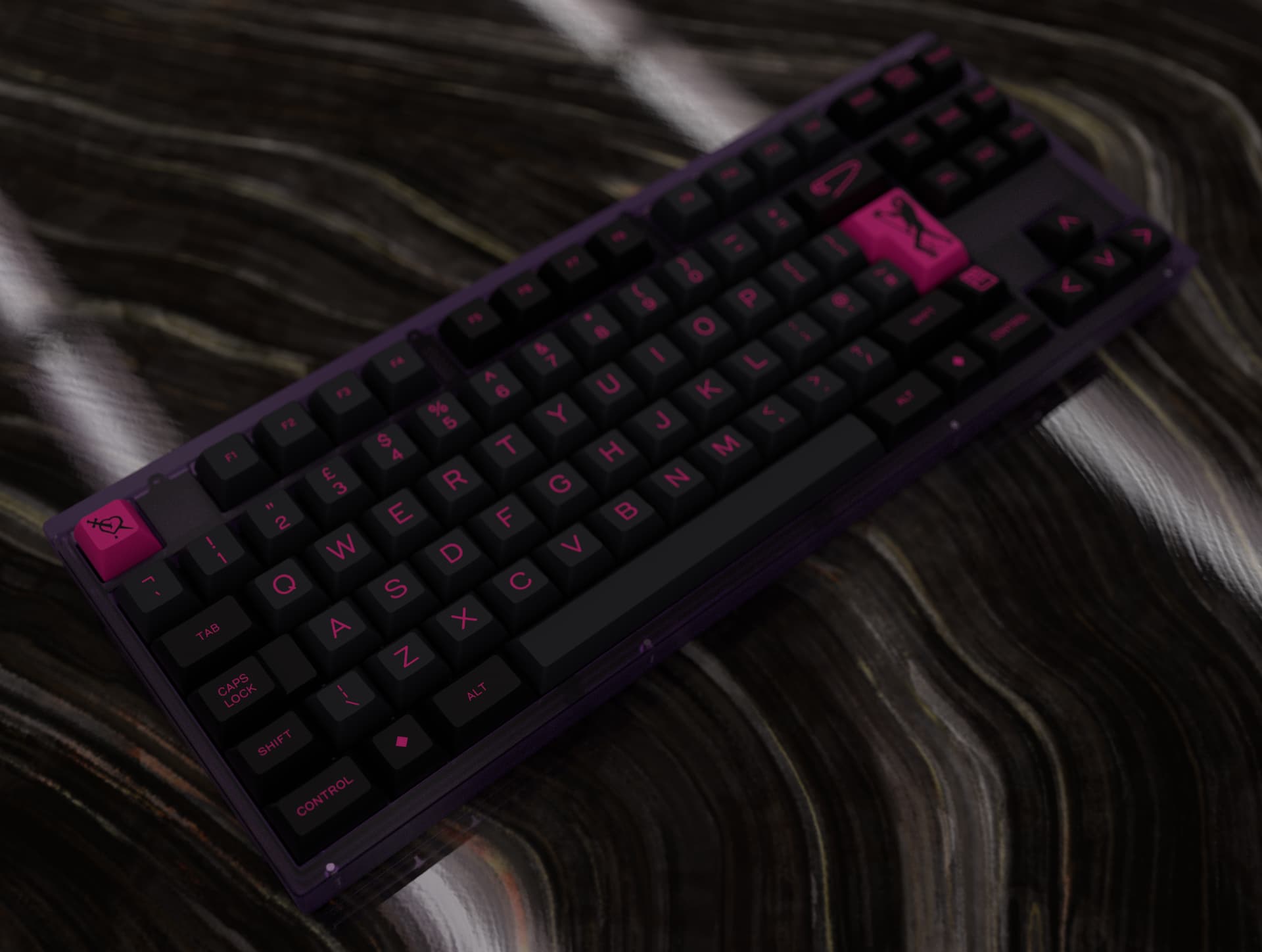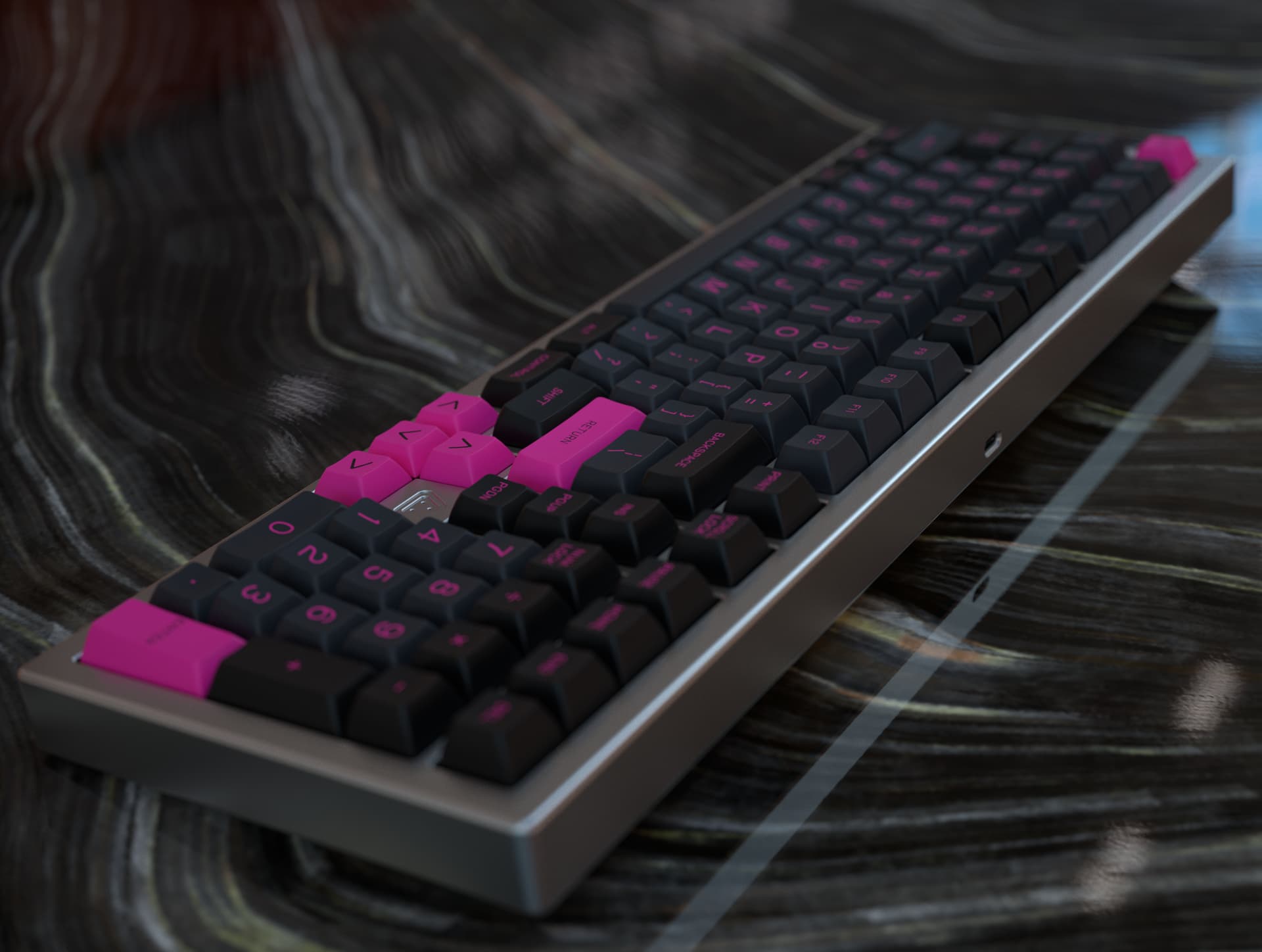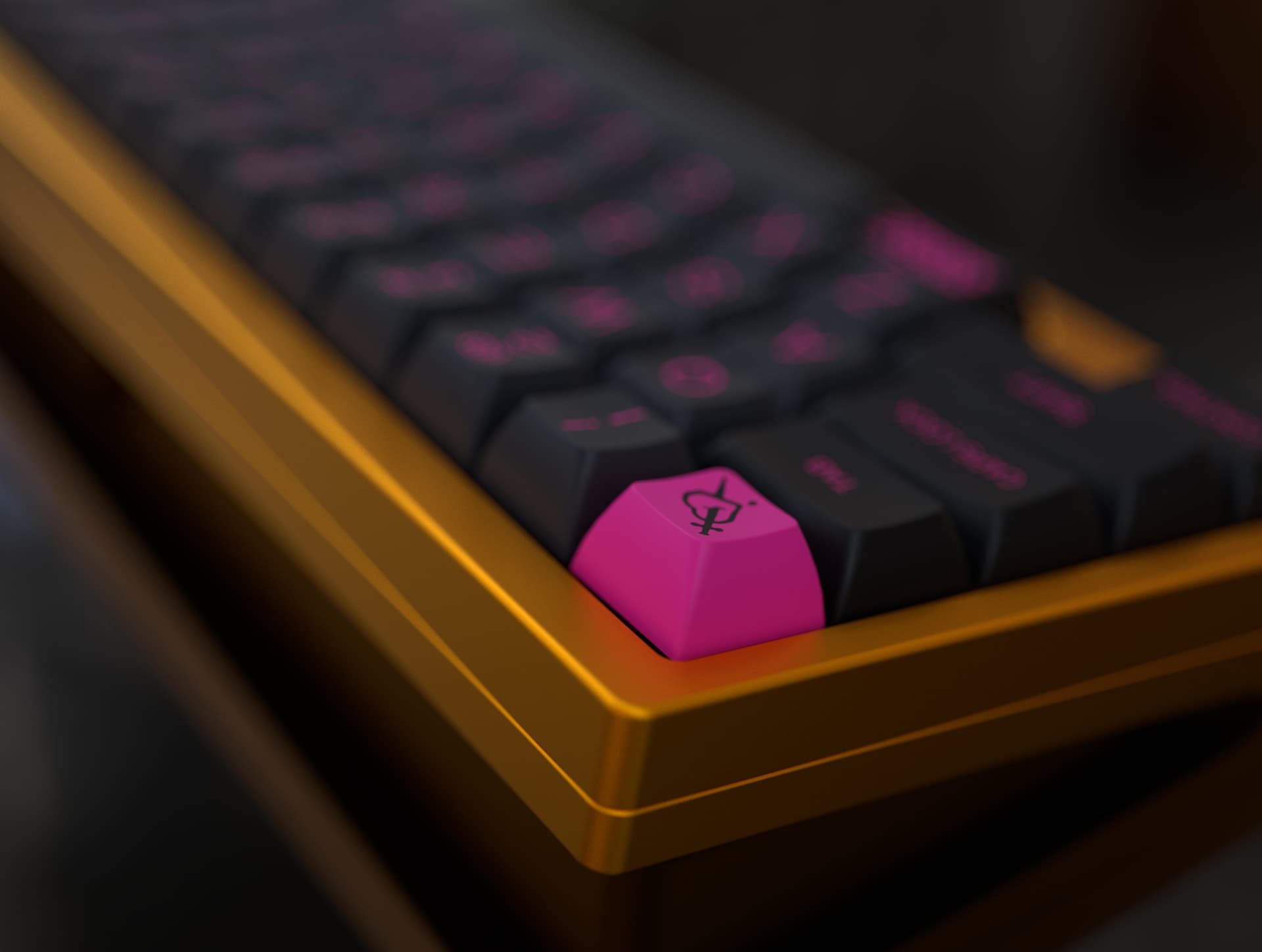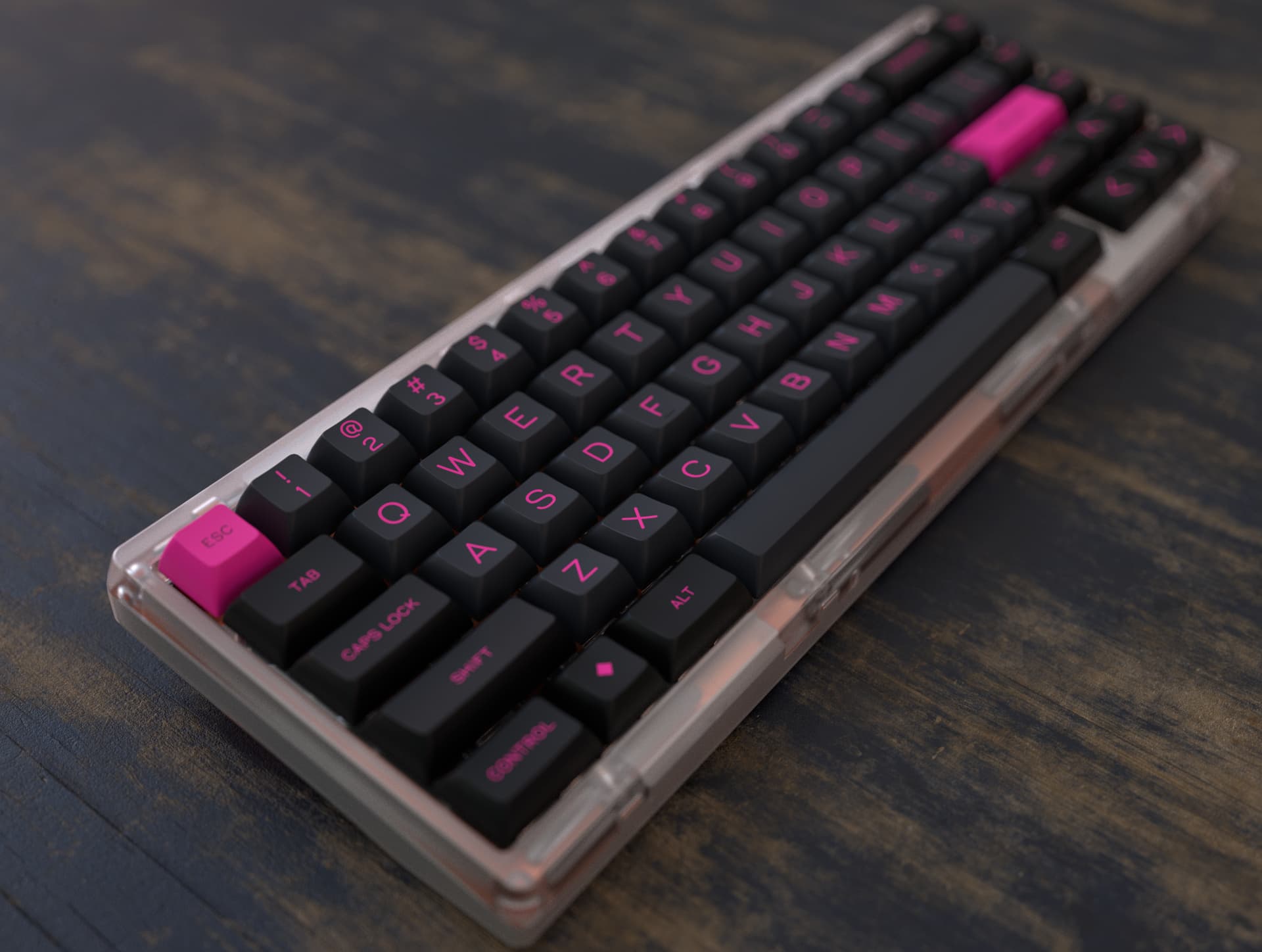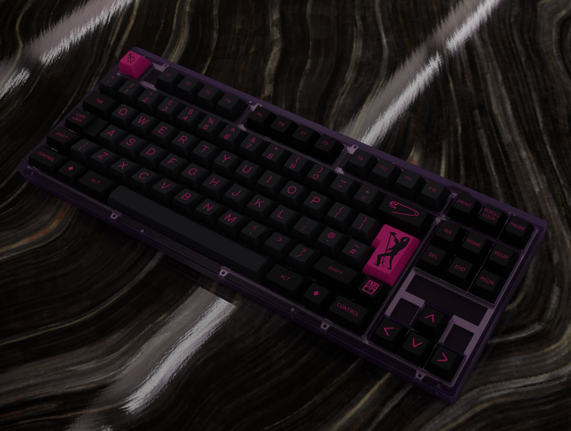 I have always admired the fashion style associated with punk and post-punk. I also think there is space for a set using a very vibrant pink. This set has undergone numerous incarnations, beginning as an SA set and later spending time in the Cherry profile. Recently, I have become interested in designing a DSS set, having tried it on many 40s keyboards at meetups, and find the height and sculpted spherical profile agreeable. So, this became a DSS set, mainly because the SP stock colors really pop, and I am tired of people telling me SA is too tall.