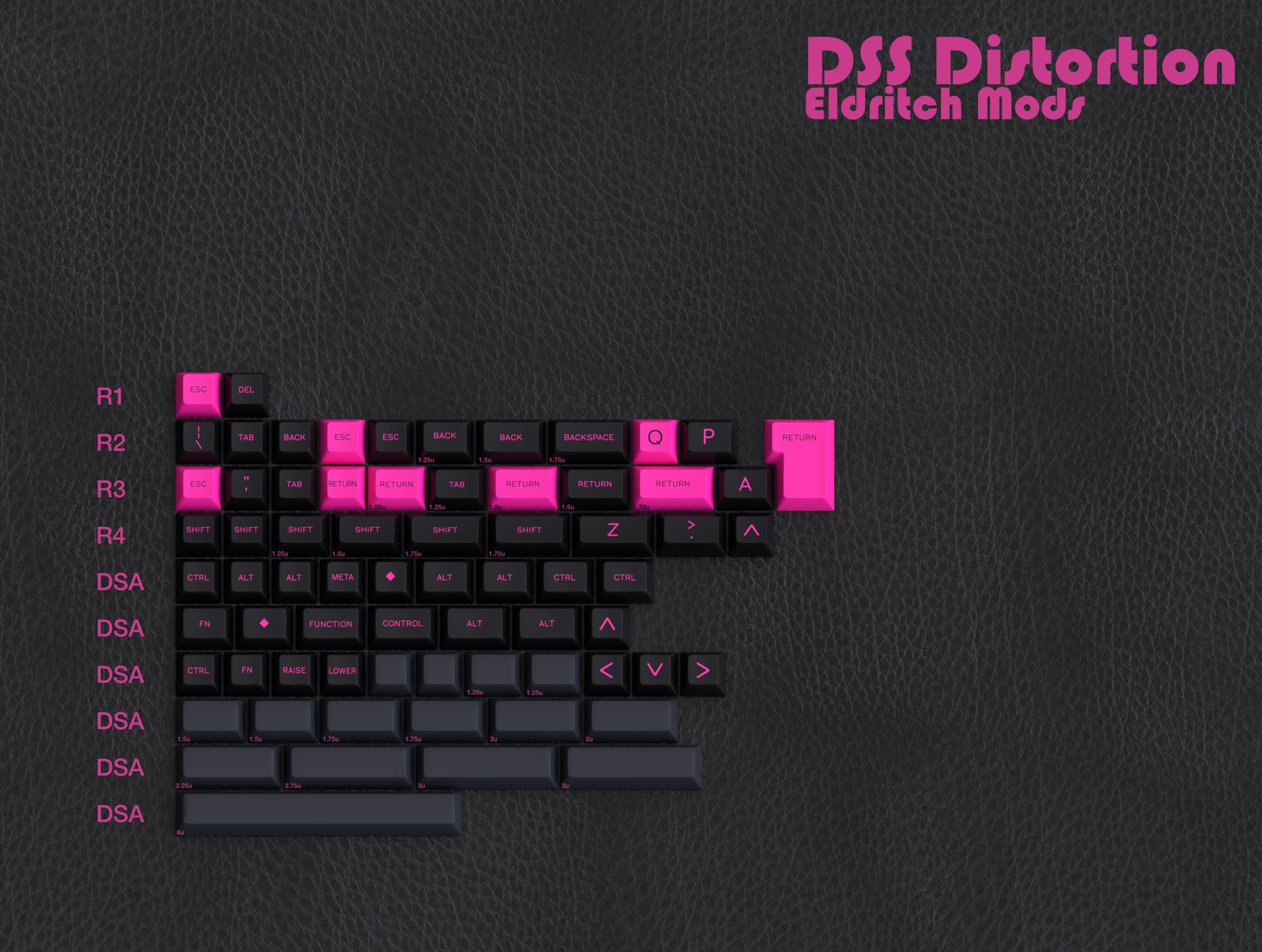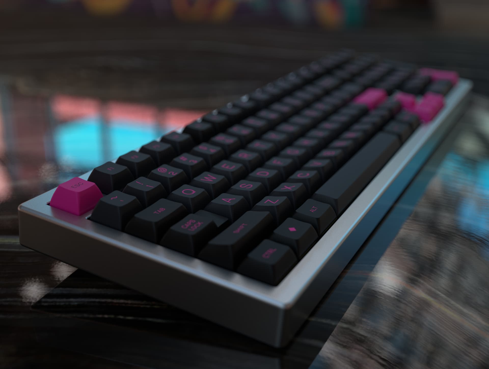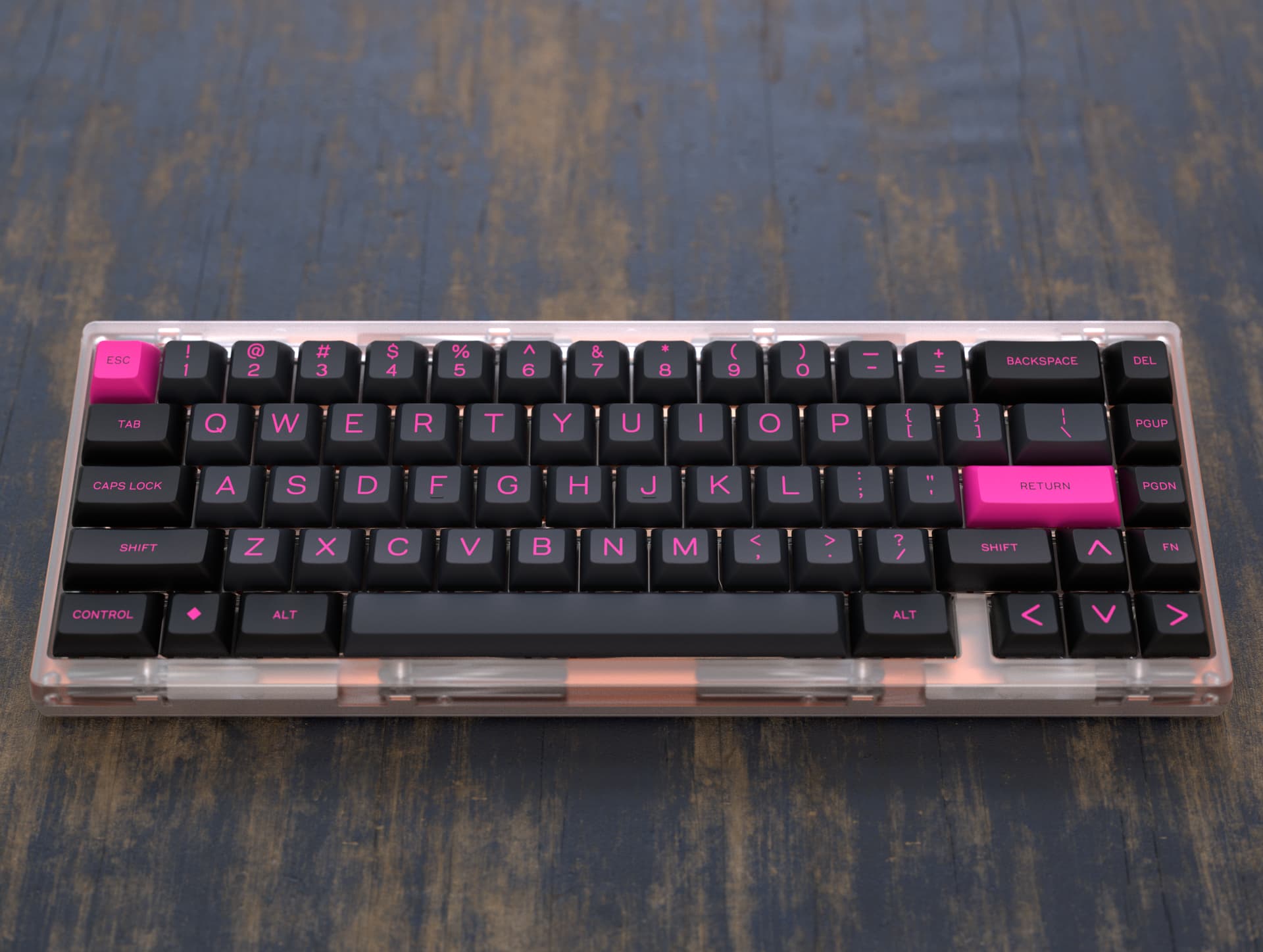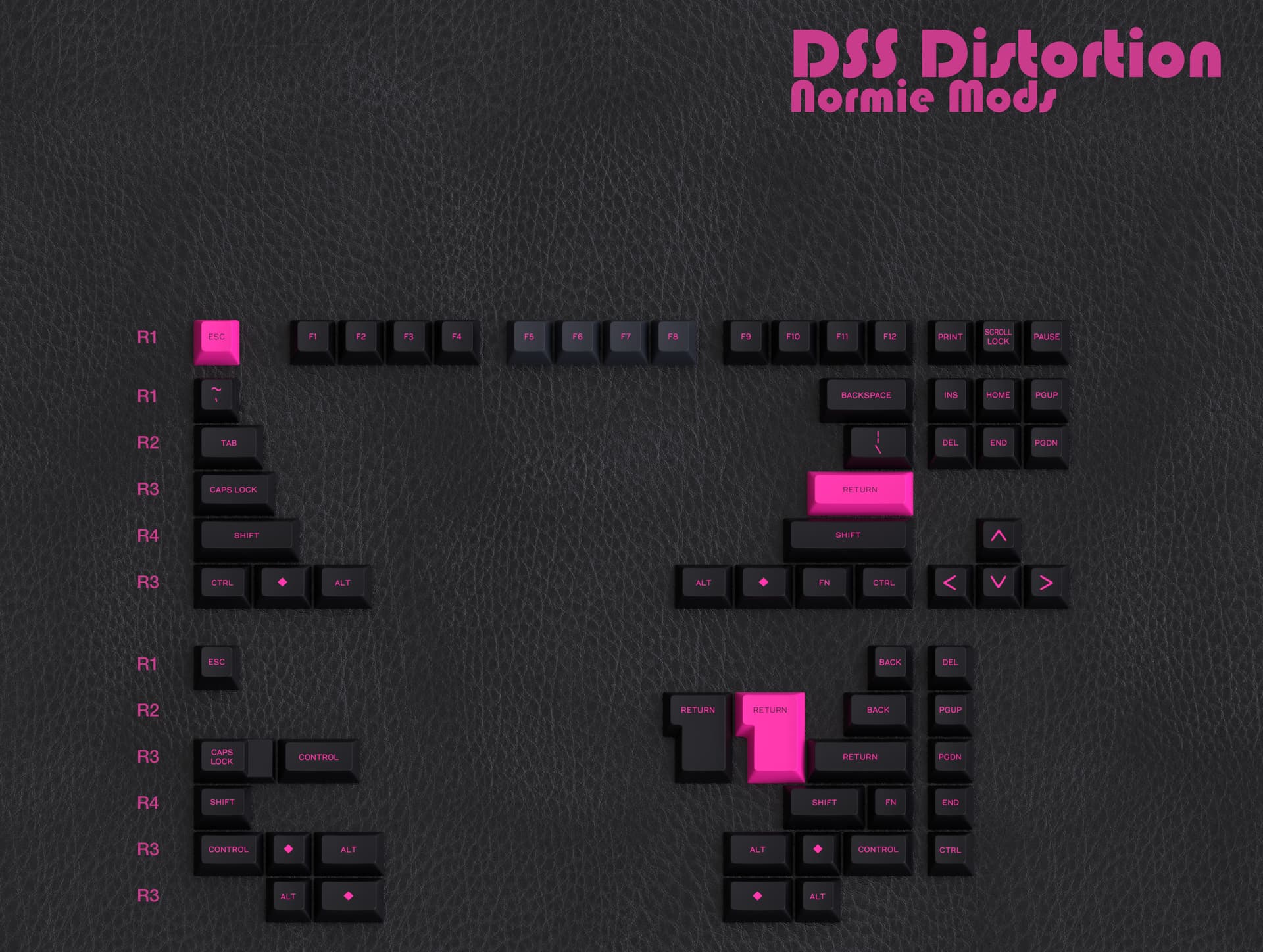 I have always admired the fashion style associated with punk and post-punk. I also think there is space for a set using a very vibrant pink. This set has undergone numerous incarnations, beginning as an SA set and later spending time in the Cherry profile. Recently, I have become interested in designing a DSS set, having tried it on many 40s keyboards at meetups, and find the height and sculpted spherical profile agreeable. So, this became a DSS set, mainly because the SP stock colors really pop, and I am tired of people telling me SA is too tall.