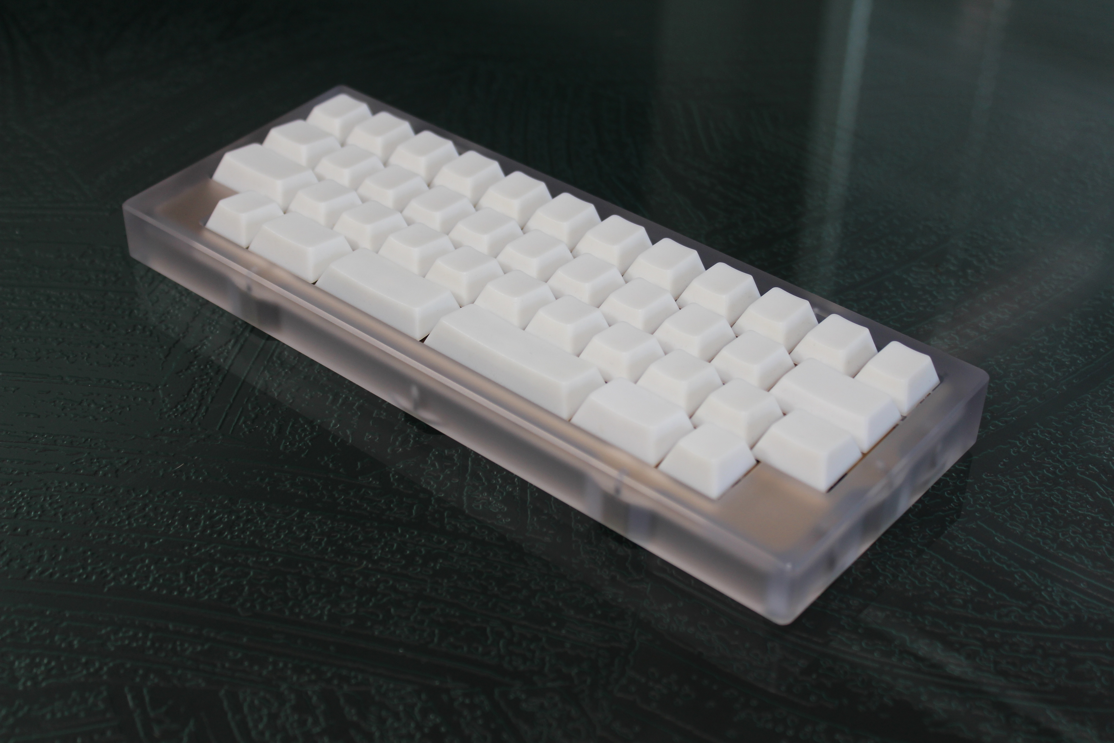 2.5 degree polycarbonate or anodized aluminum case. No top and bottom halves, the entire case is a single piece to maximize thock.