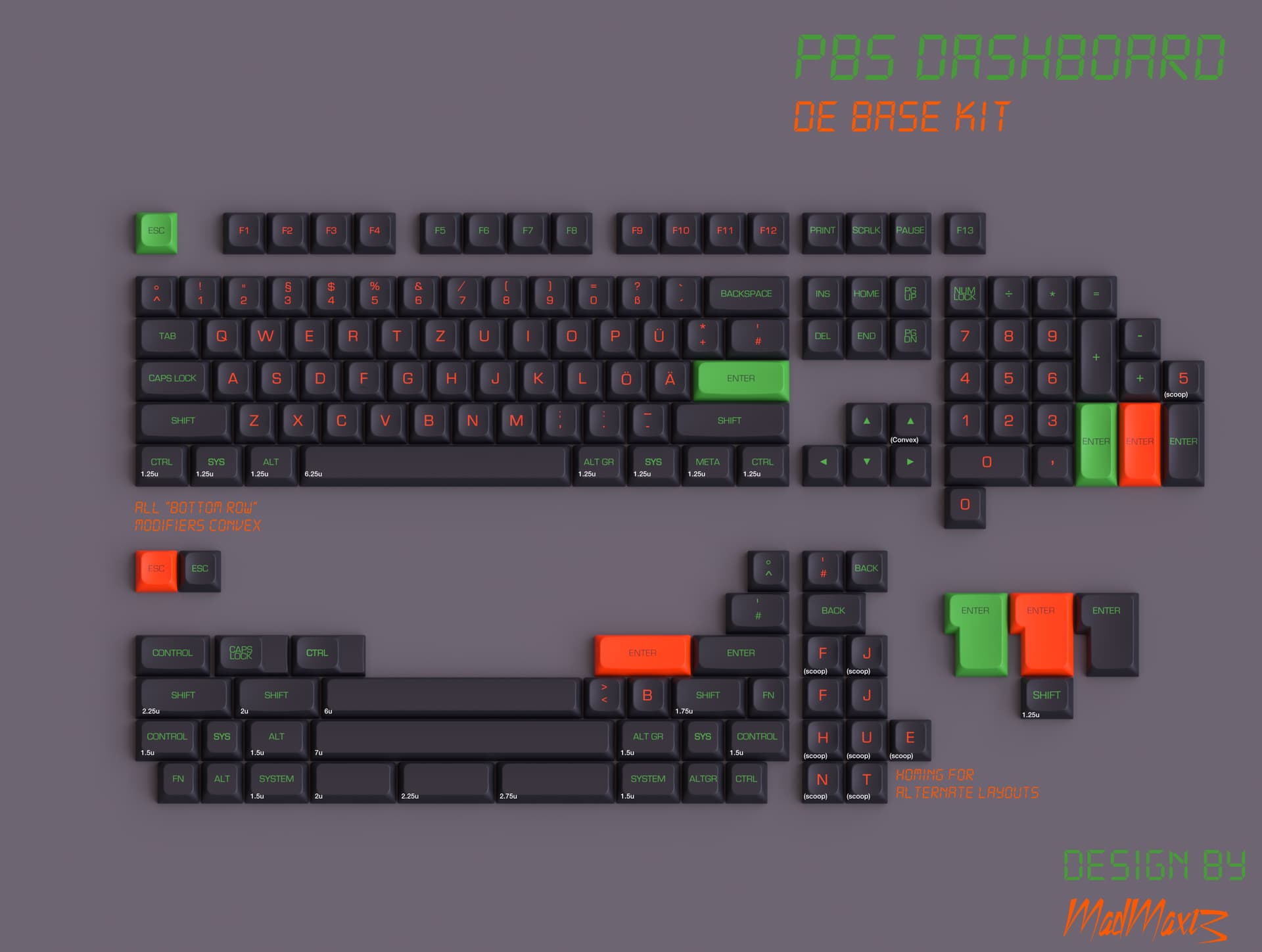 Even though this set was popular during its interest check as an MTNU set, it failed to attract a US Vendor. After using PBS Aperture, I thought PBS would be a nice pair for the overall “look” of Dashboard. Furthermore, PBS is dyesub, which allowed for more customization of the design typeface and more colorful novelties. I am proud to present the PBS Dashboard. If you like this set, please fill out the interest check.