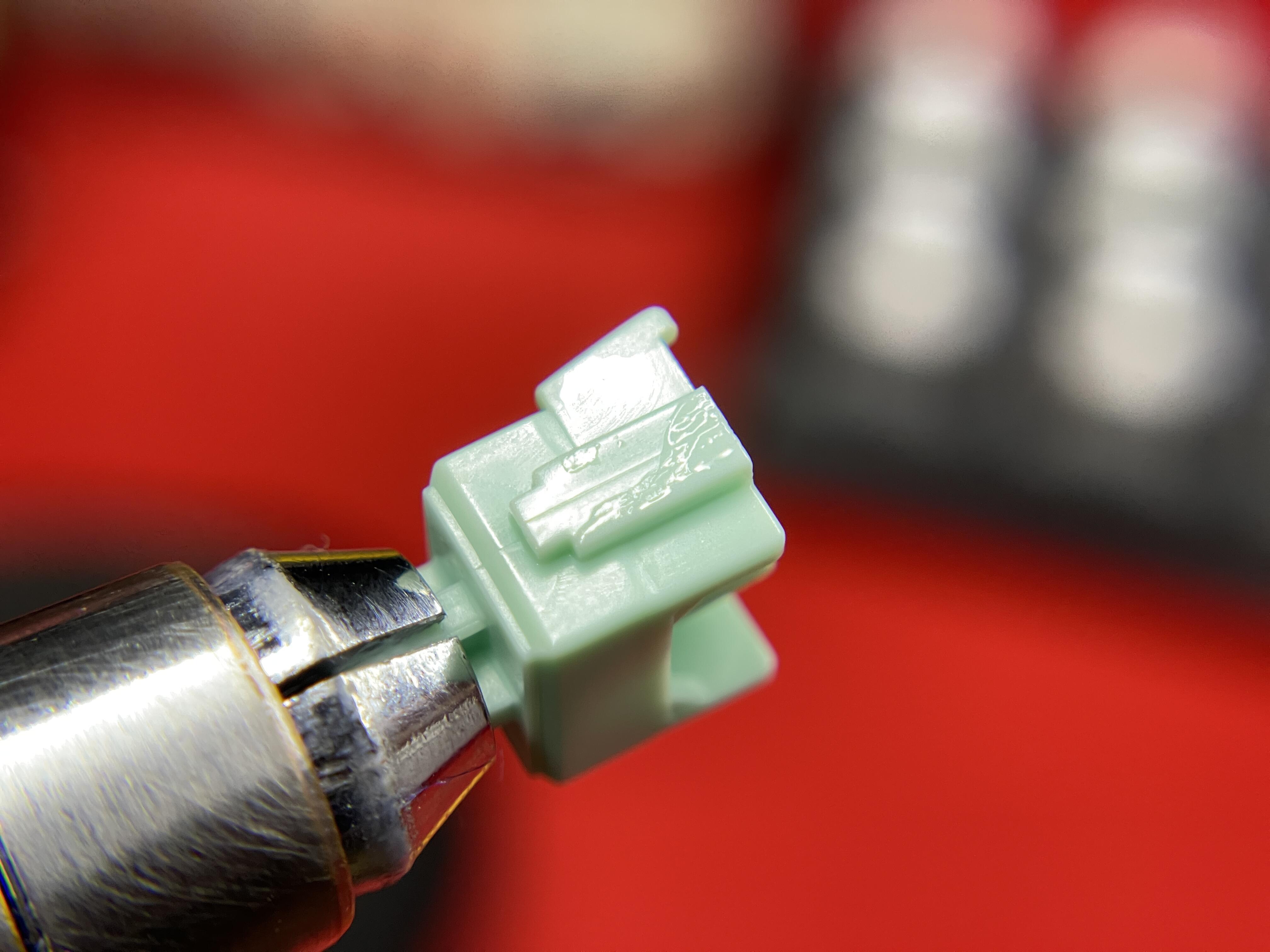 Factory lubing on the Anniversary switch is light and appears to be applied to the bottom housing stem rails and picked up on the stem. Spring is also very lightly oiled.