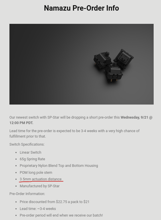 Edit: I would’ve called that travel distance, not actuation distance if I were them. Actuation distance of 3.5mm implies that the switch does nothing until then. Maybe they’re making an anti-speed switch.