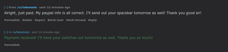Thank you! I would, but I’m hoping out of the seven PMs I sent, at least one person would at least respond. I really considered switching to 6.25 in the meantime, but I’ll give mech market a day or two.