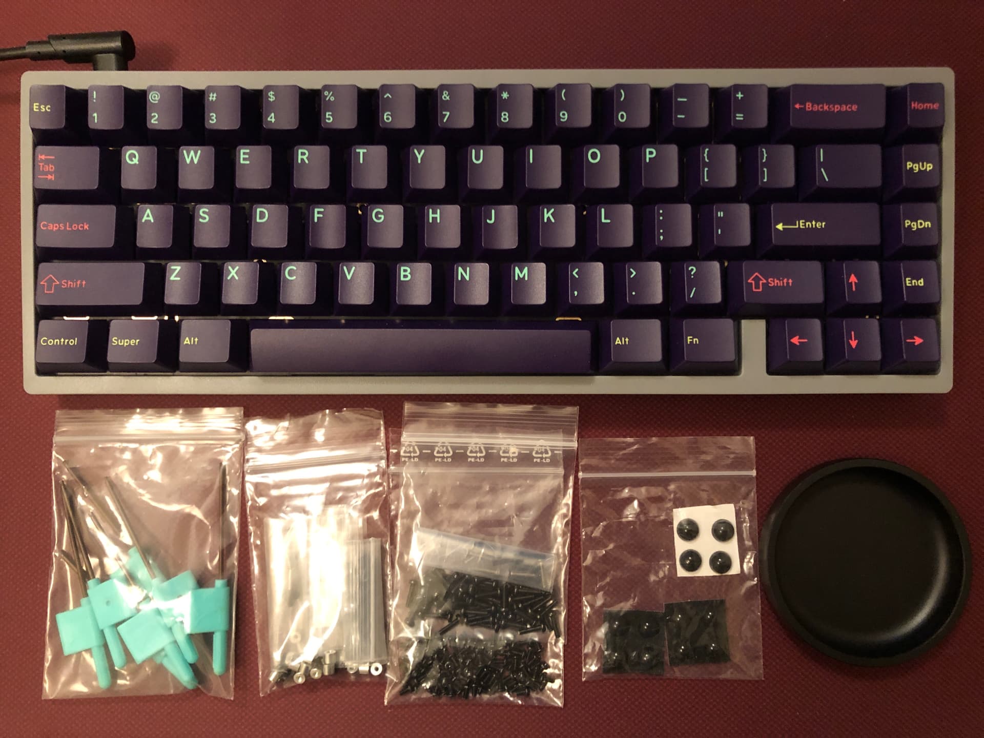I customized this keeb for him a while back by wrapping the top plate with laminated auto vinyl, changing the cable, tuning the stabs, and installing some modular foam under the plate and the PCB.
