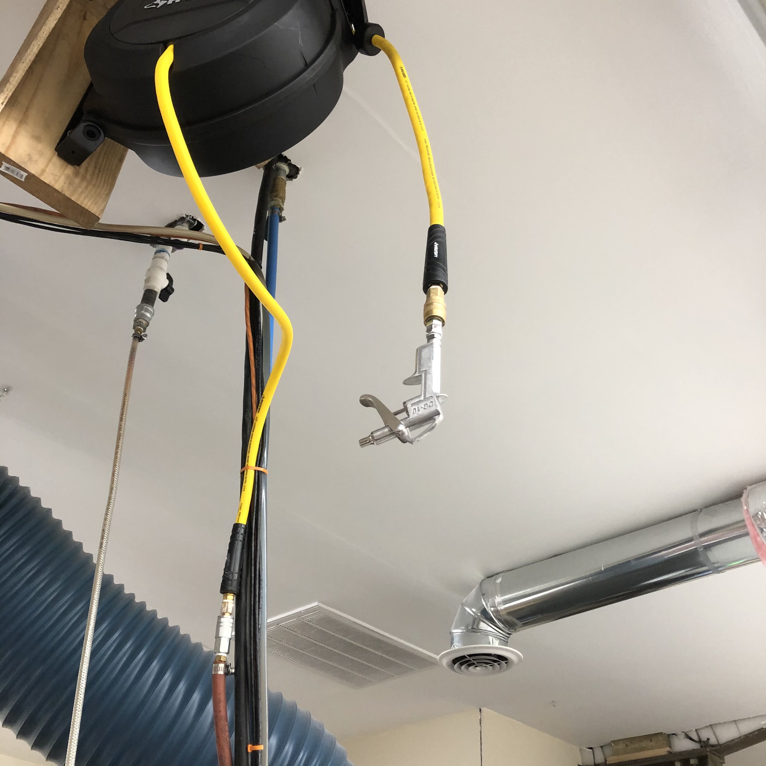 I’m considering installing a permanent air compression system in my house with a drop-down hose next to my keeb shelf…