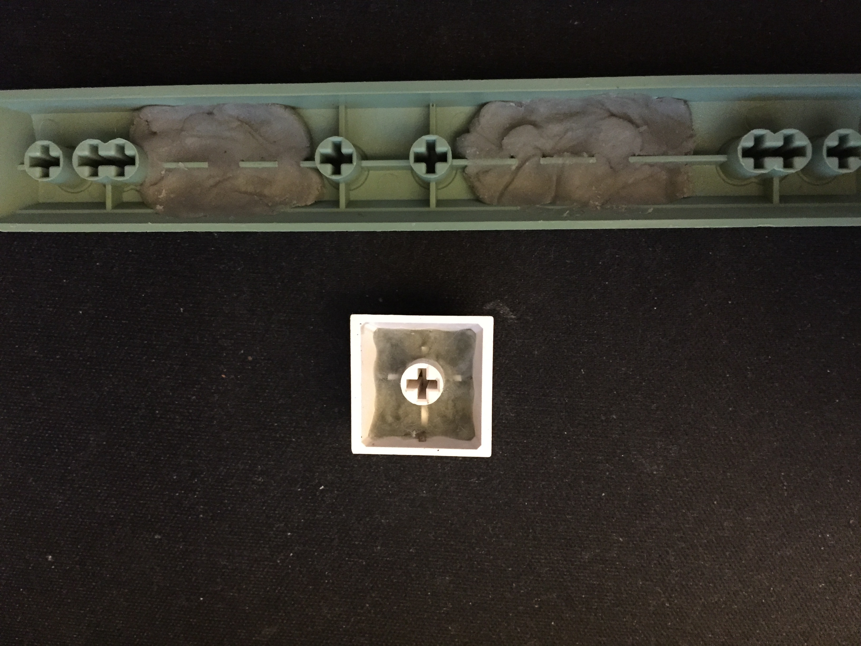 As to difficulty of the mod, it’s not that hard. Just mix two parts of epoxy clay, make small balls out of them to insert into 4 quads then flatten into place with a Q-tip. Each keycap should take no more time than it takes to lube a switch. With small plastic stamping tools, it should also take no time to add tiny sound-dampening cones on the surface.