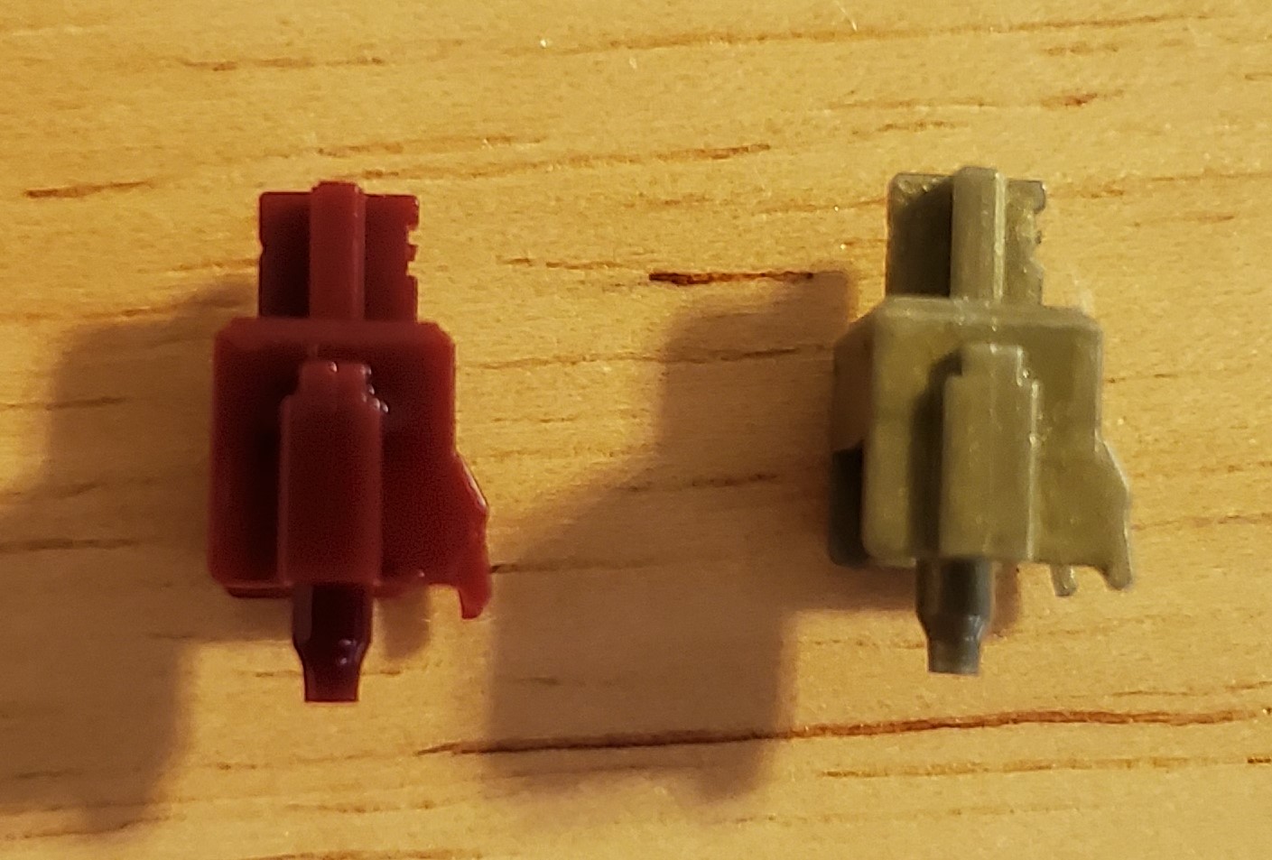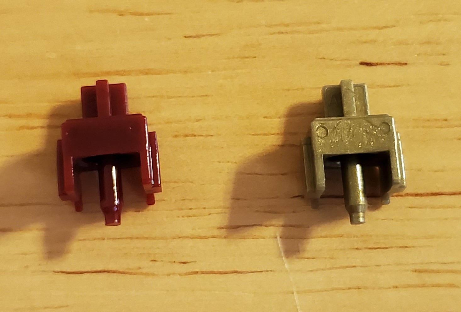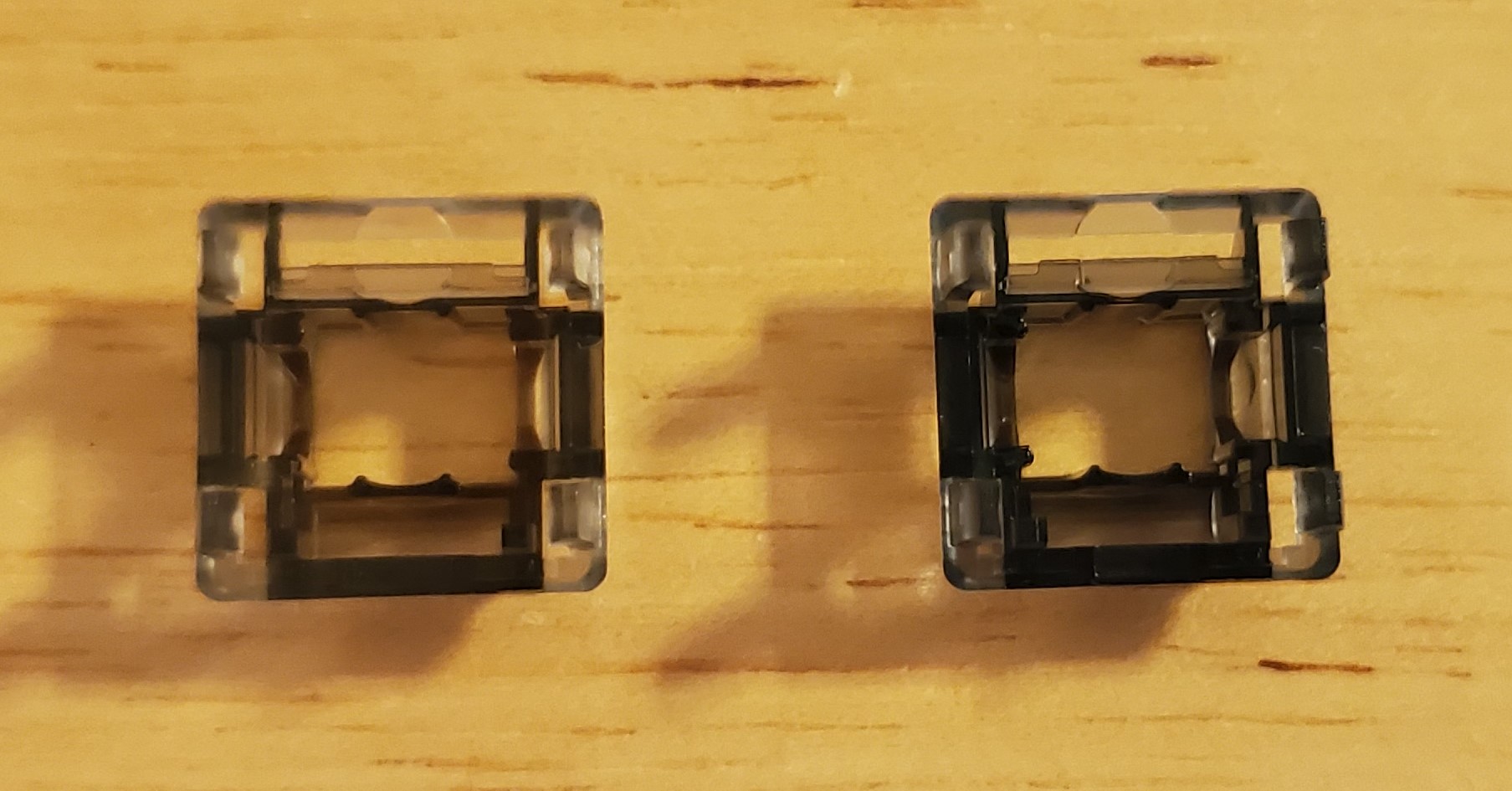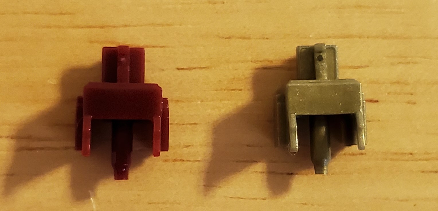 A bunch of comparison shots of the Durock Light tactiles (left) & Parallel Pewters (right). Form your own decisions from the pics, but the light tactiles really seem to me to be almost copy of the Pewters. Mold marks match up well & stems seems shaped the same. The only major differences beyond color I can notice is the Light Tactiles have different housing materials (nylon bottom, PC top. Pewters have a PE blend housing), the springs (67g for the Light Tactiles & 58.5g for Pewters), & the Light tactile stems seem to be polished while the Pewter stems do not seem to be. Both great switches IMO/IME & will get you a very similar typing experience regardless of which you use. The Pewters have a slightly higher pitched sound due to housing material differences which seems to be the biggest difference I’ve noticed between the two.