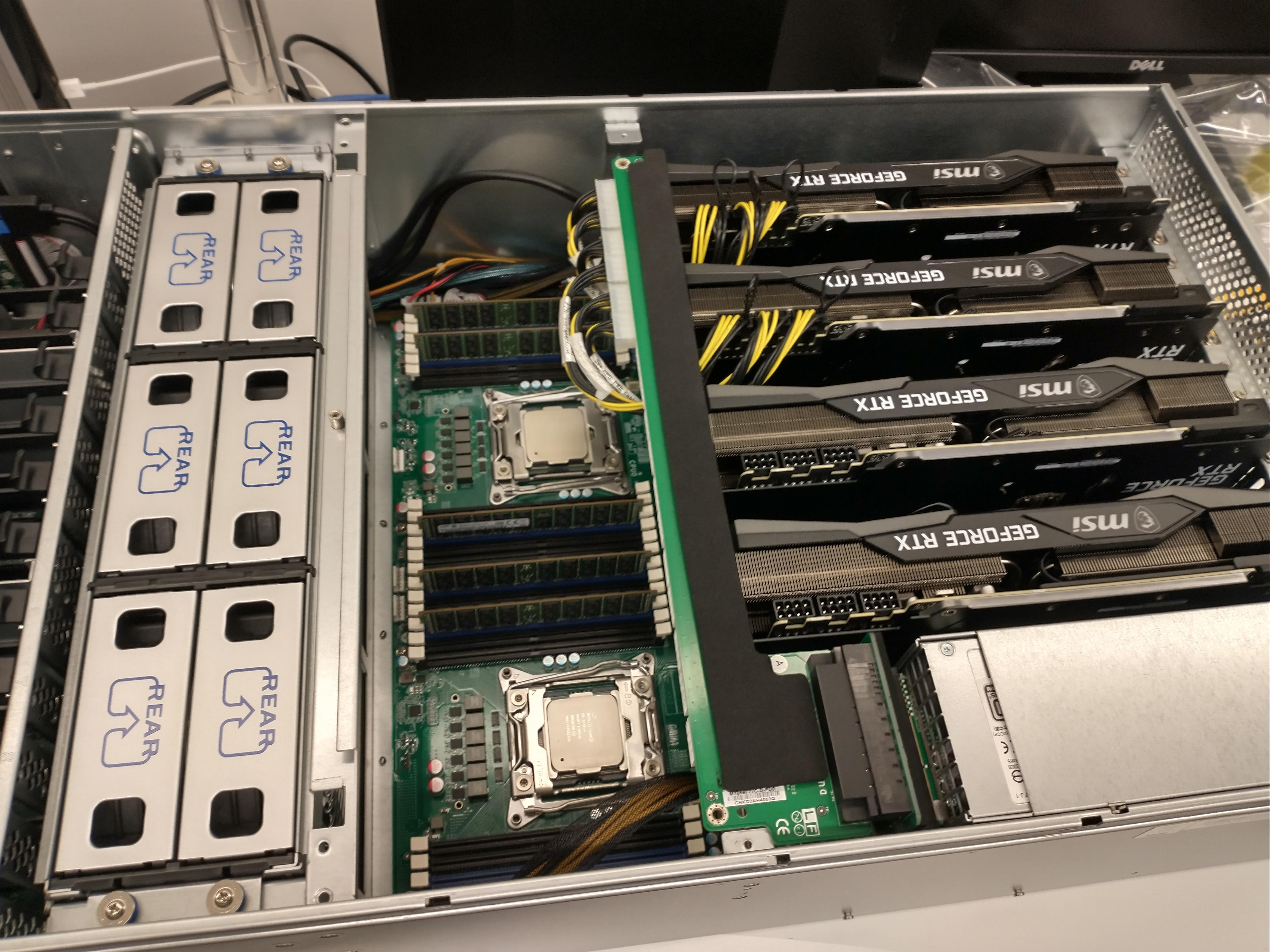 And yes, that’s 4 3090s. We actually bought 5 because the guy who ordered the parts didn’t realize these are 2.5 PCI slots thick each and there’s just no more room. I don’t know and don’t really care about the rest of the hardware in this thing, we basically just threw in some mediocre CPUs and the minimum amount of RAM to get the graphics cards running. Anybody want to guess what we’re doing with it? (Hint: not mining, or at least that’s not the intended purpose)