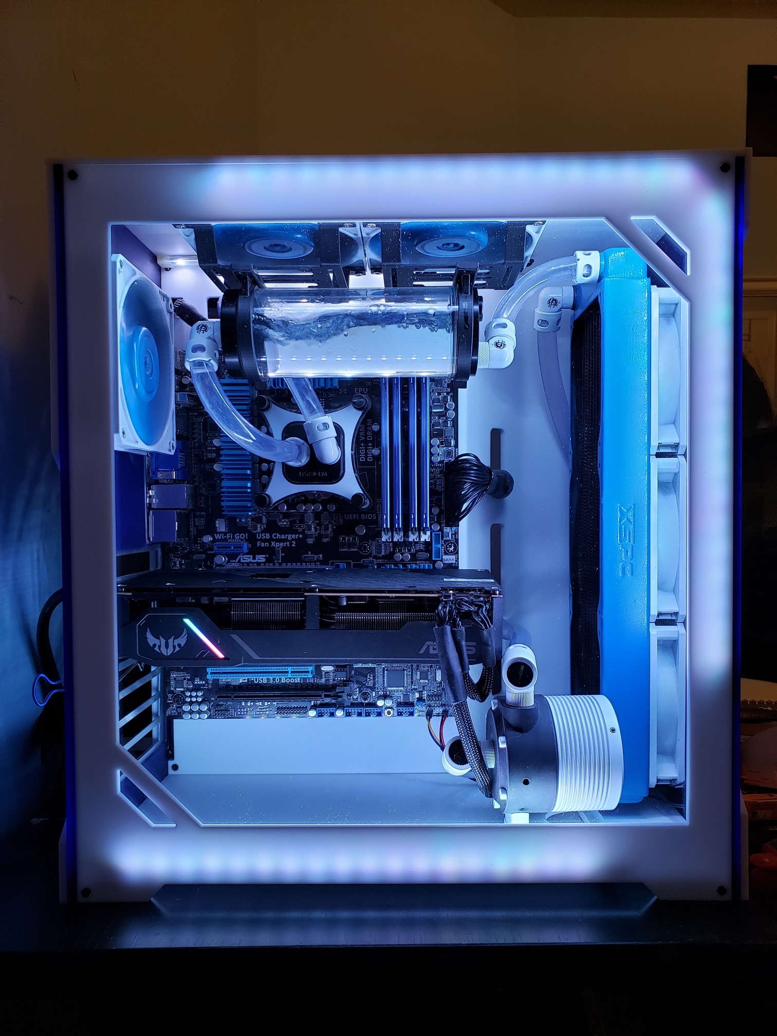 Here’s my current build. It’s been a slow progression of a build since 2012 with old parts and new. Went thru multiple case changes as well until I got to this one which is fully acrylic. No RGB, just good ol’ bright white-strip LEDs lol. I called it Project SharkBAIT since it’s essentially my guinea pig for my custom watercooling builds lol. Going along w/ the colour scheme of white/light-blue/black.