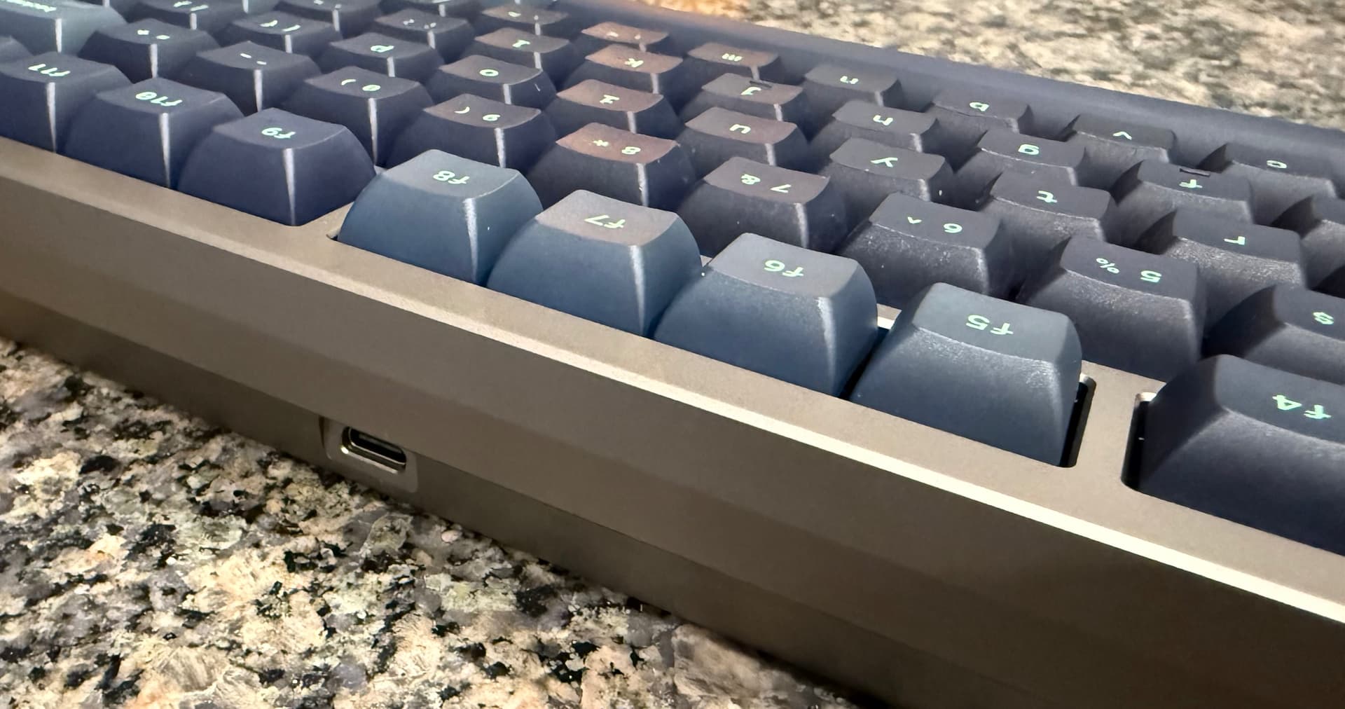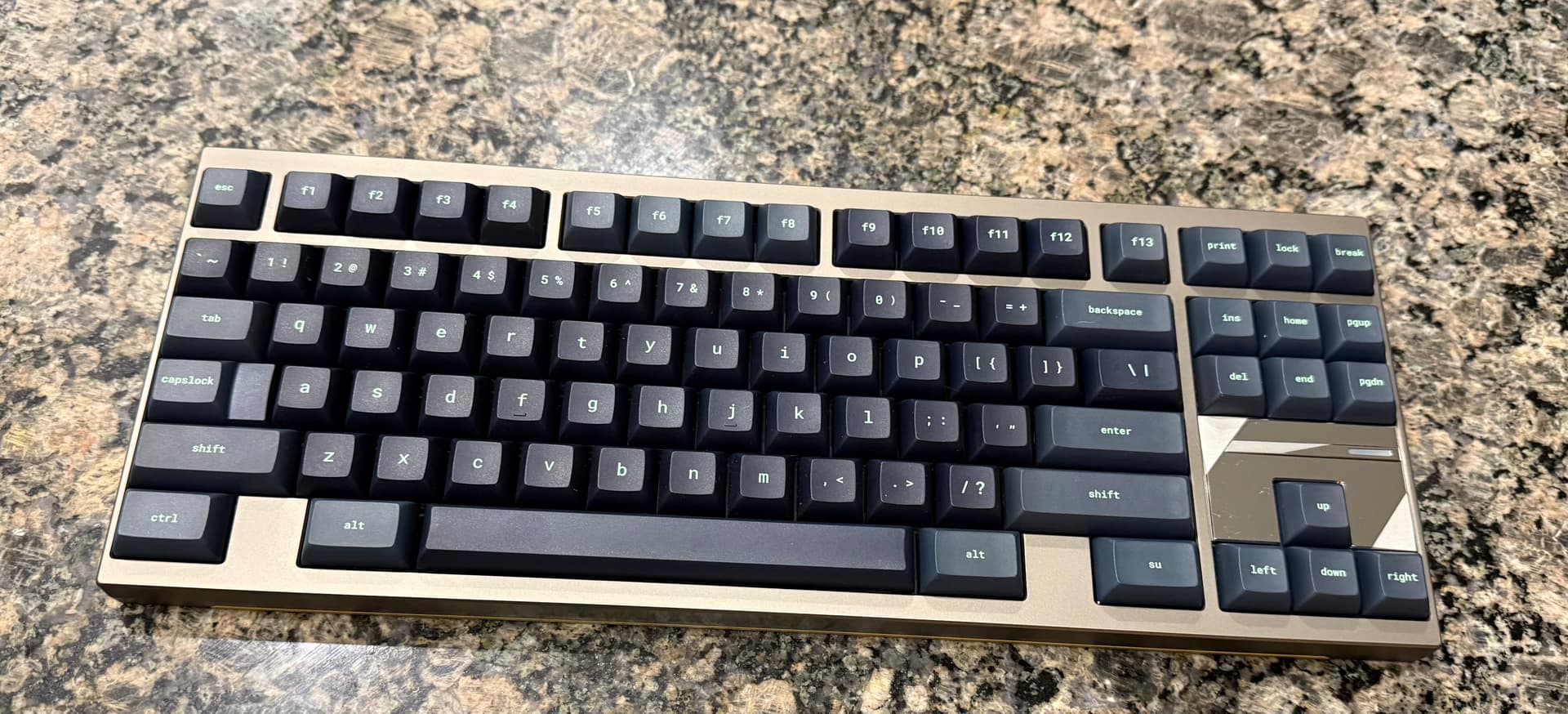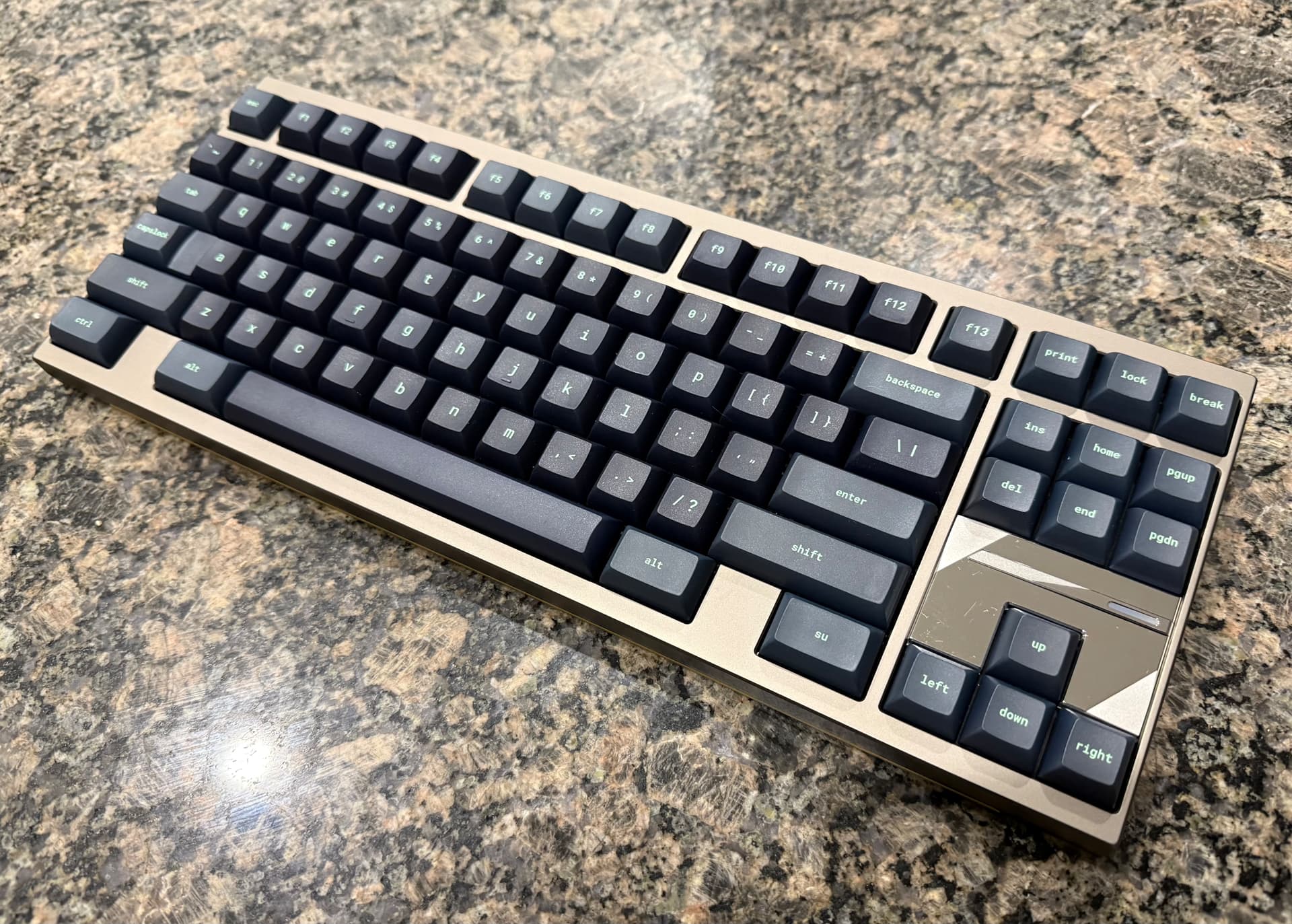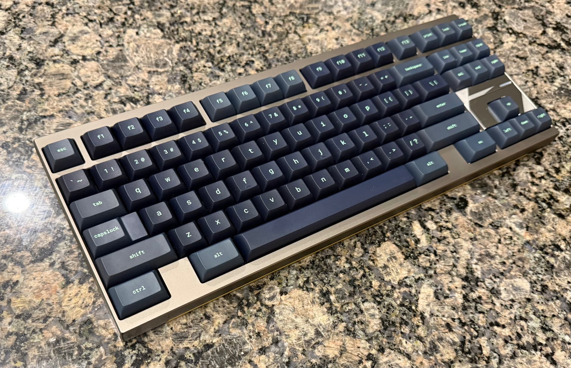 Mechmarket PBS MV Classic and KAM Superuser arrived. I sort of half-assedly laid a few caps of each on top of the unicorn-barf on the DK1-TKL, and I think the MV Classic popped almost a bit too much against the top case. I also get a little feeling of being wasteful (which I do not want to unpack, given this is my hobby) when I leave numpad caps in the box, and the KAM helpfully did not come with a numpad kit. So… off to the kitchen island for the quickie photoshoot…