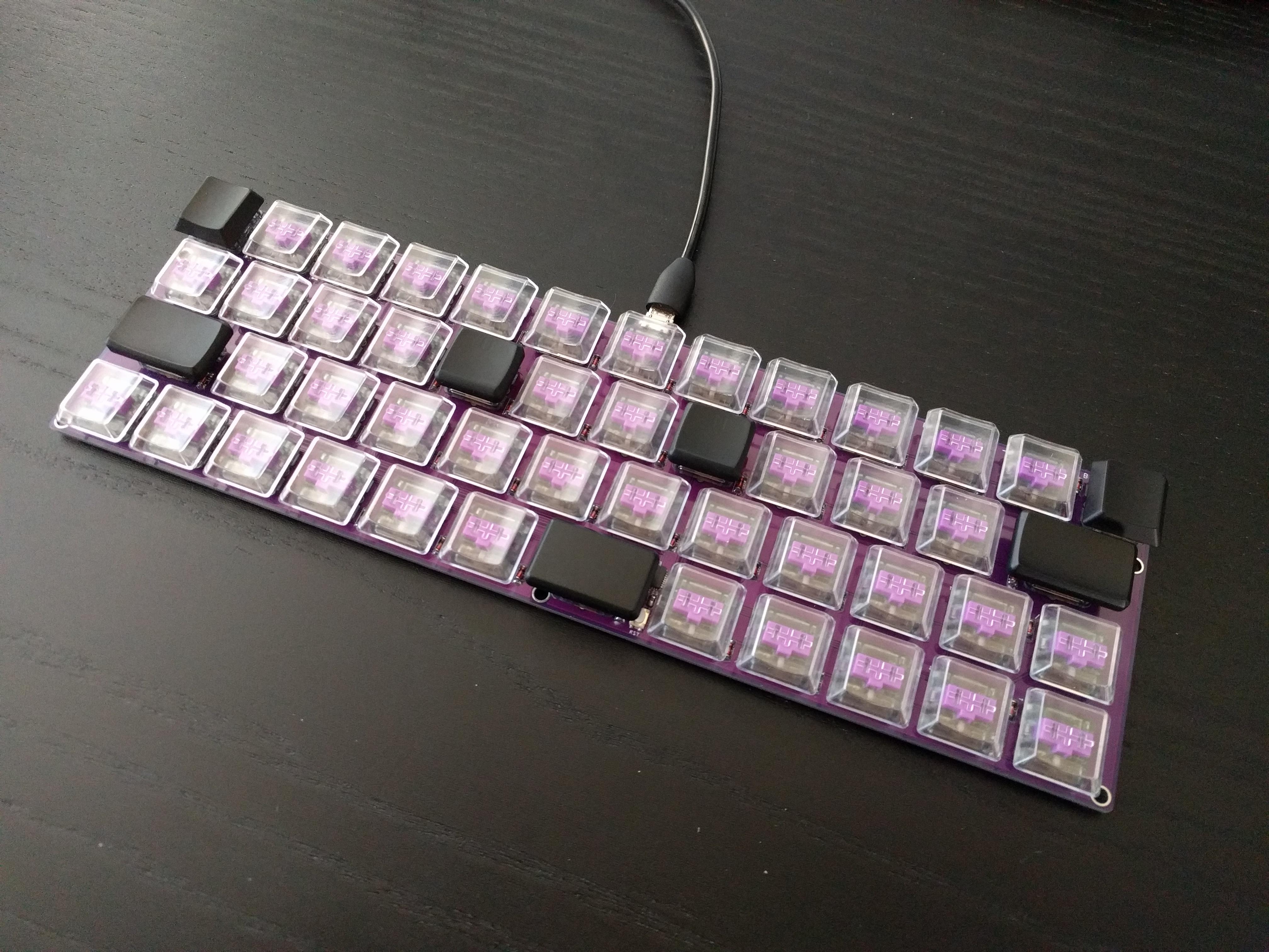 Kailh Purpz, 49 keys, three 1.5U keys, no stabs. The keycaps are a bit of a mess, because there are no 1.5U transparent ones, and I needed the homing keys, but I will probably use MBK Legends once they are released sometime this century hopefully.