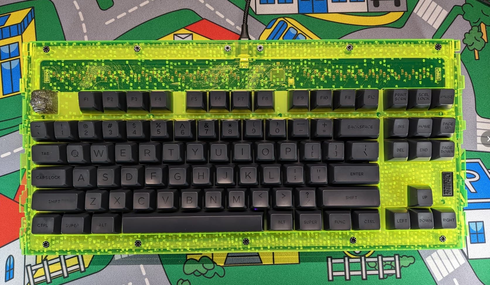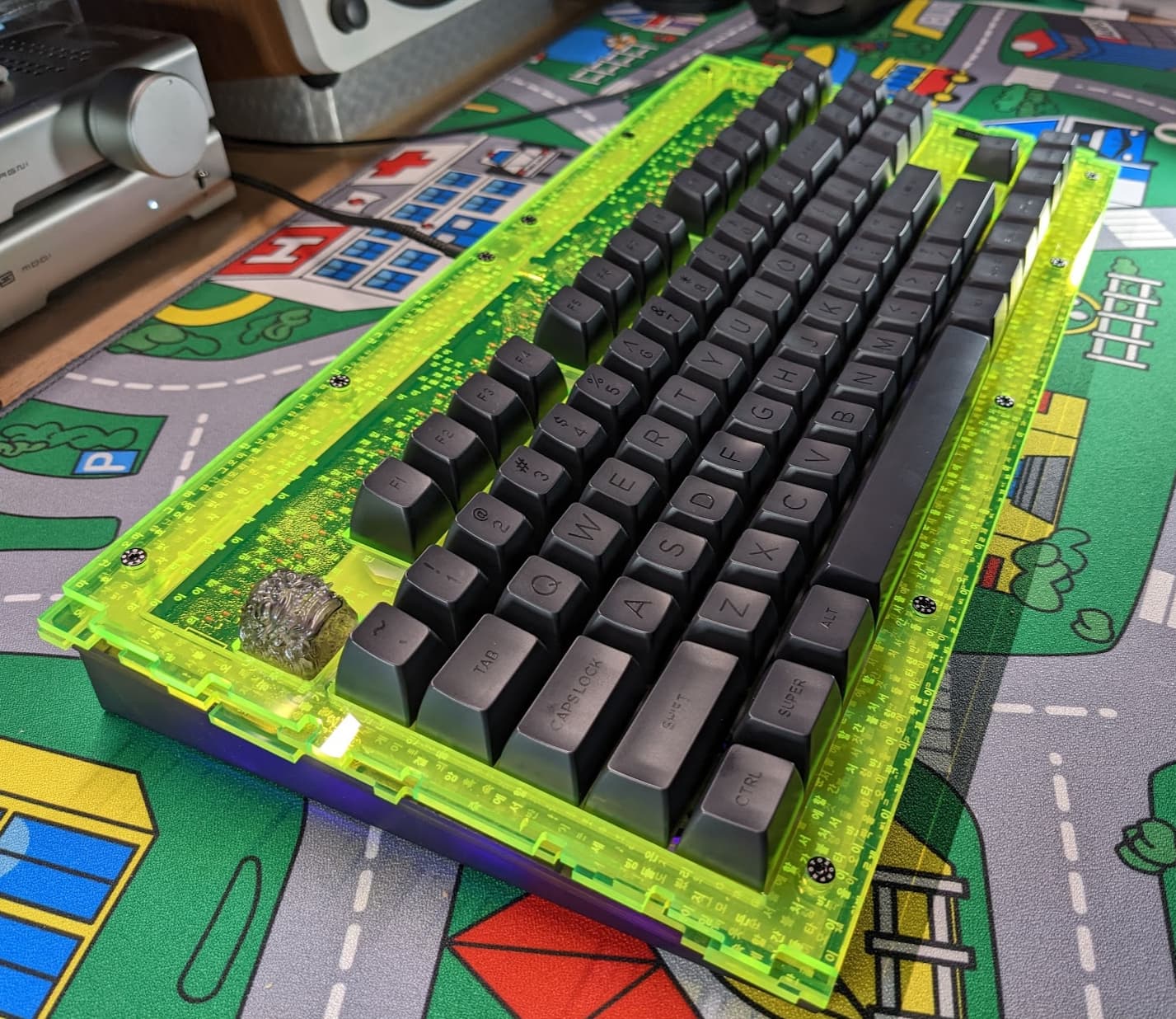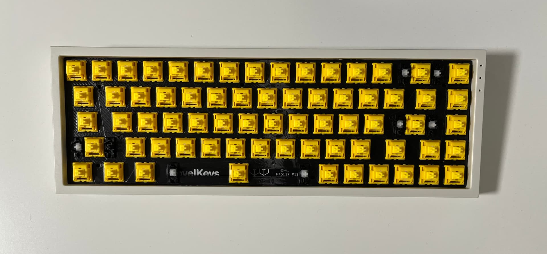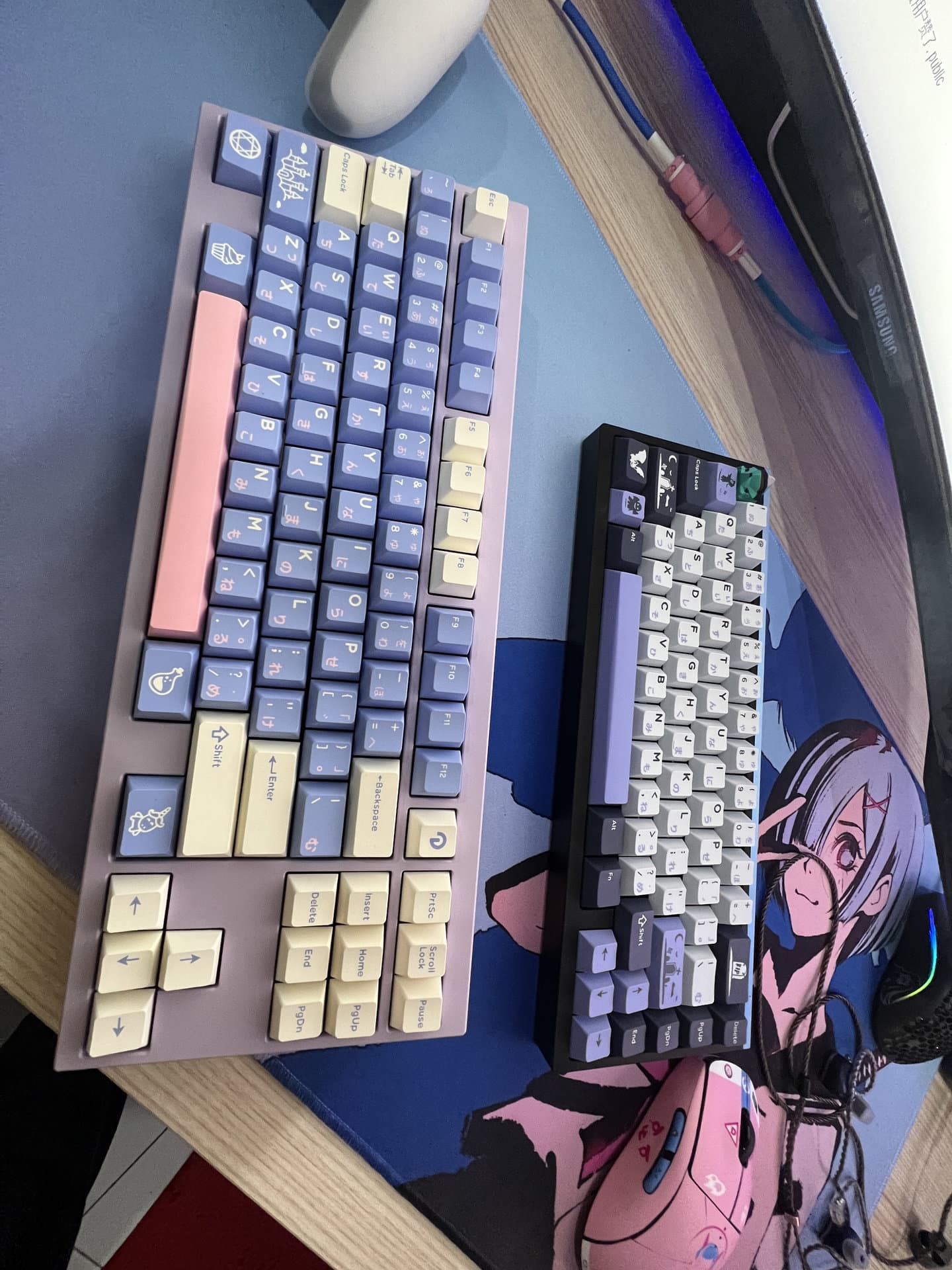 i really like floating boards but dont have much choices, many better built items wont sell in my region. this is a cheap chinese board called fe87. switch gateron yellow, unknown pbt caps, i dont like the shape, bought it for the looks, didnt know they are all same height and shape. okayish for gaming, very bad for typing (ive been using it for almost a year and still making typos.
