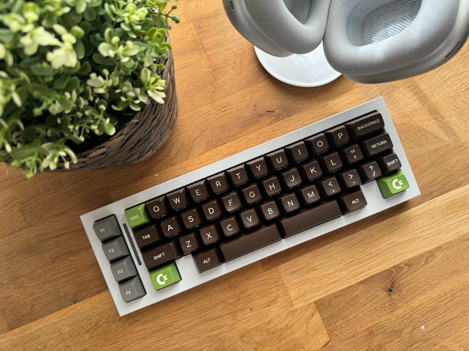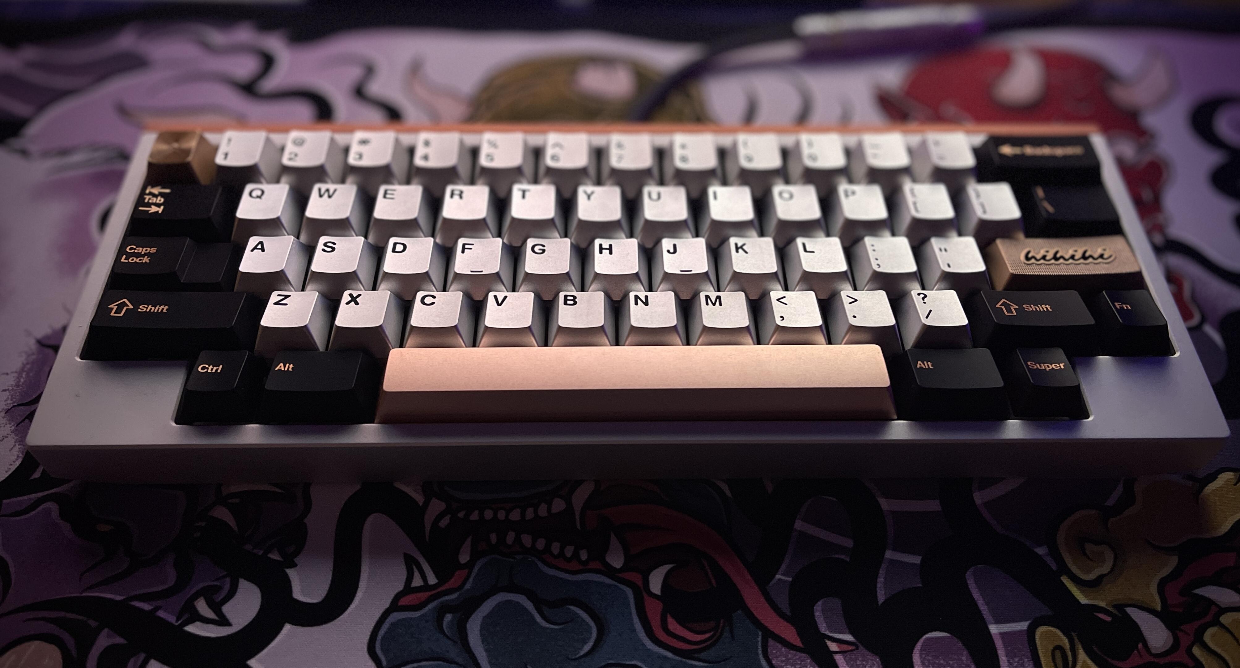It is a Keychron Q2 with the sound upgrade kit and some extra foam, and PBT MT3 keycaps, in particular the Serika set. The switches are factory lubed Glorious Pandas re-springed with 85g springs.
