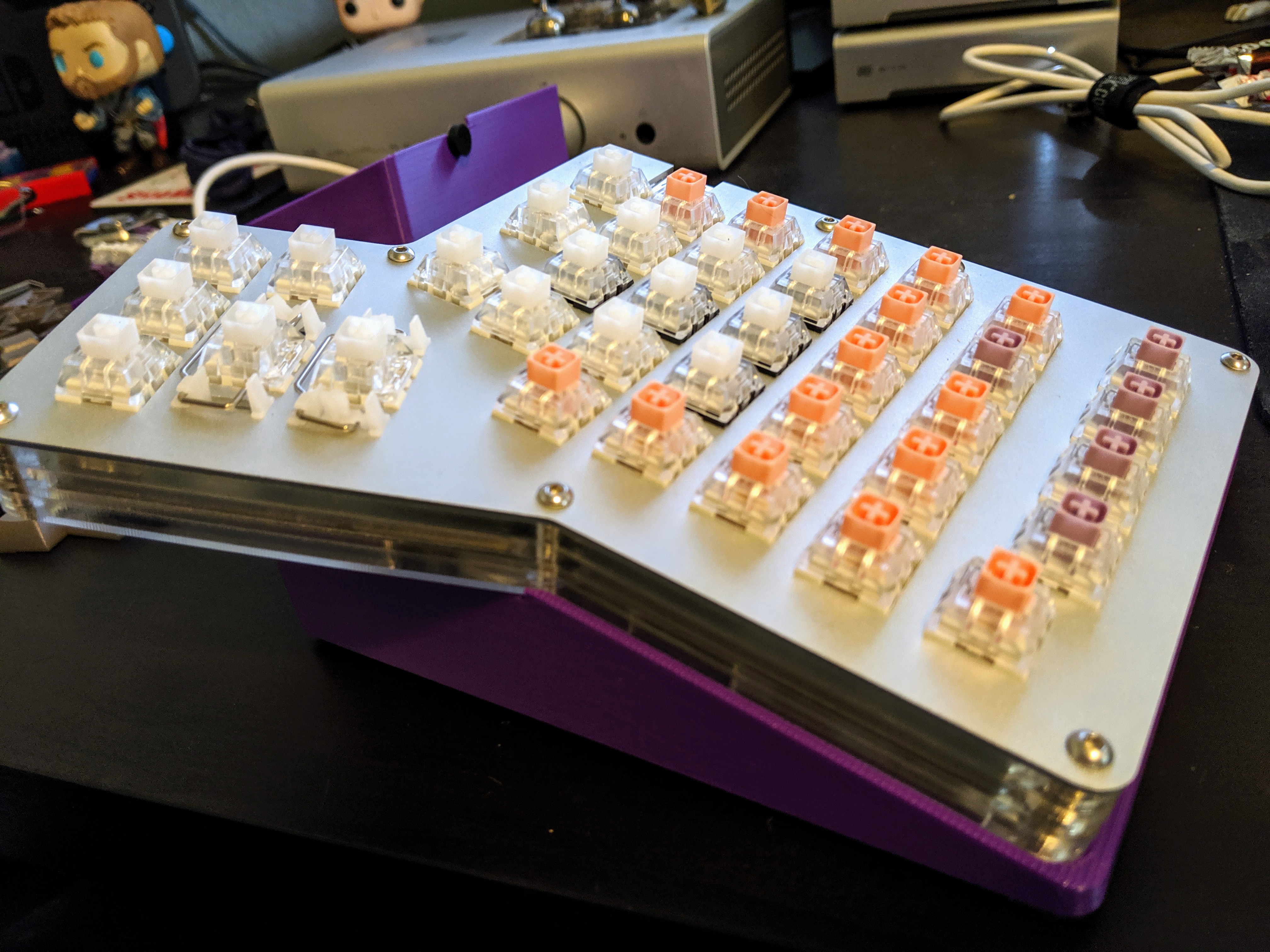 HotDox with some cheap DSA Dolch while I decide on something sexier. For the case, I swapped the top acrylic to the bottom cause I love me some exposed switches. A friend took the CAD file for the case from Alpaca and came up with a 3D printed tenting solution that I’ll get posted to Thingaverse soon enough to share with everyone.