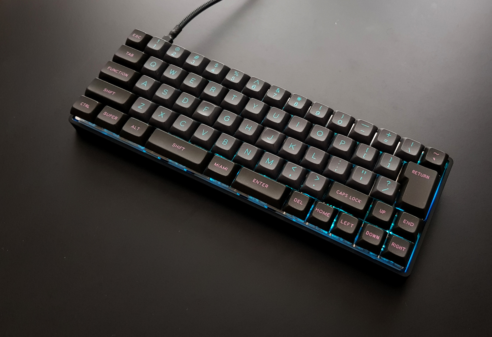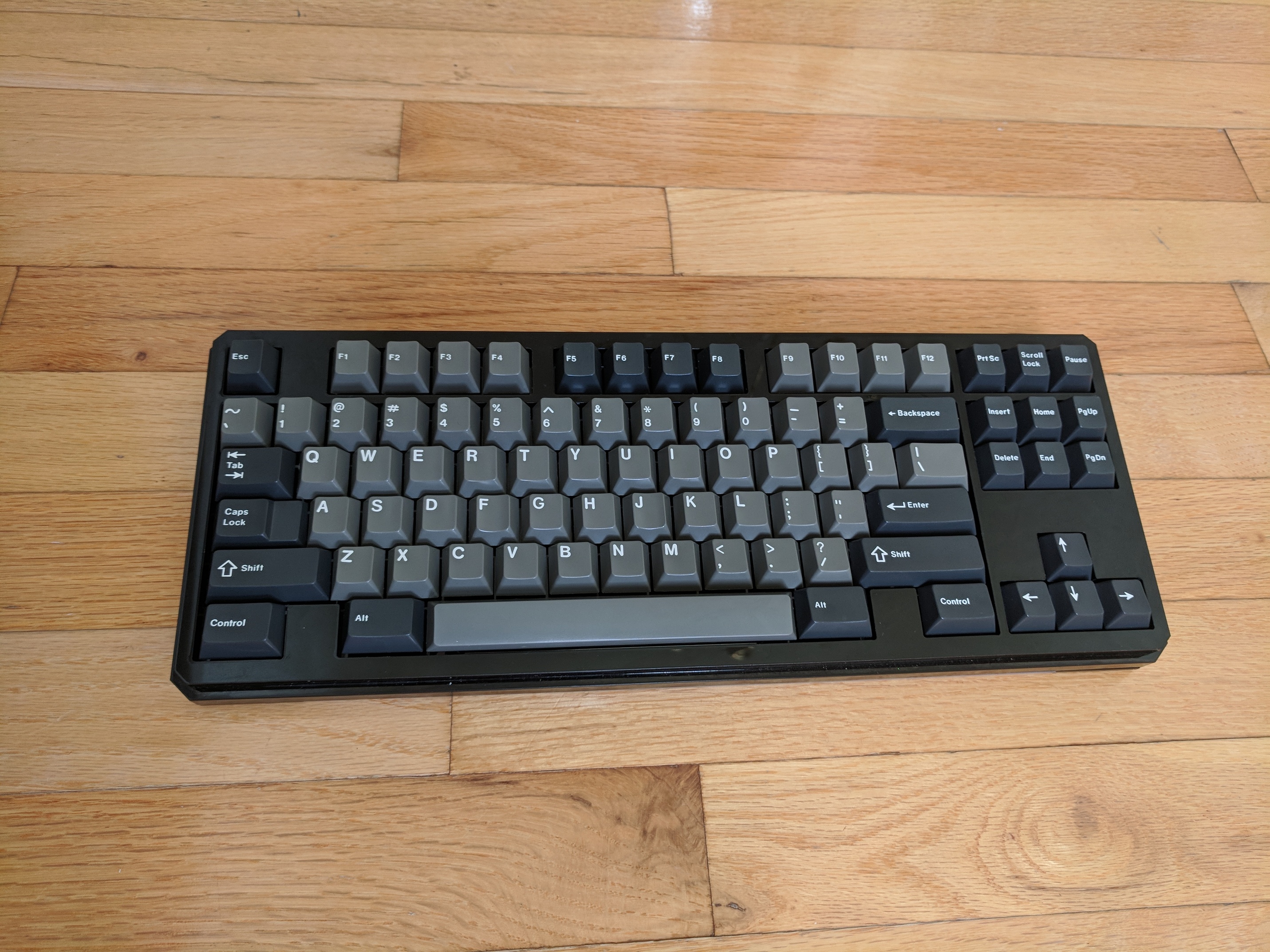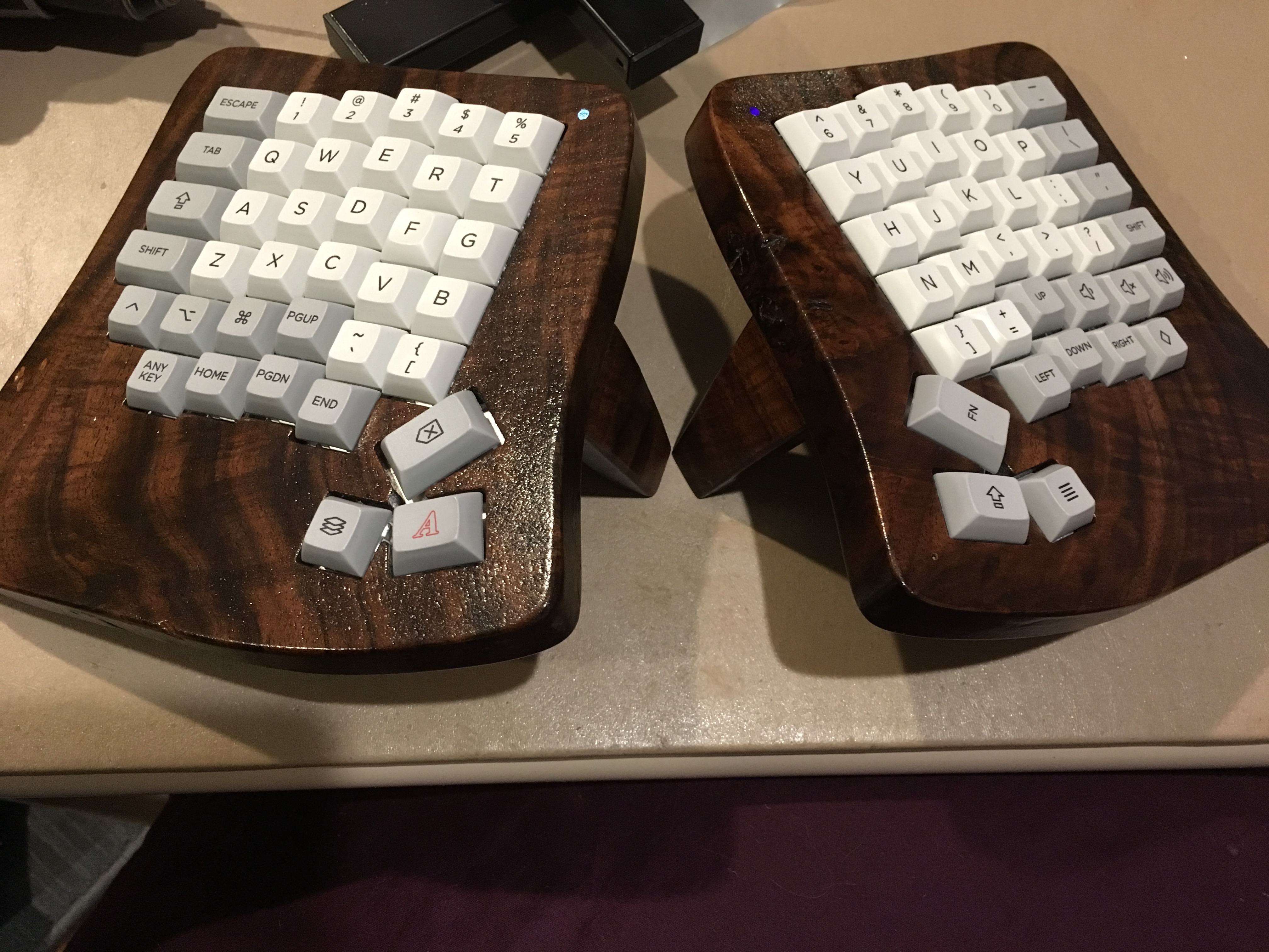 Walnut case, Zealios Purple switches. In this photo it’s Granite DSA’s but I’ve replaced them with Canvas XDA’s and changed the layout a bit. Custom 2 piece bluetooth board with custom, still in progress firmware on GitHub