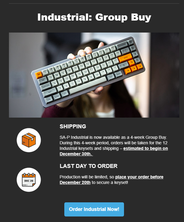 I don’t exactly understand how a product they had in stock is now running as a group buy, but it is what it is. 10% discount for preorder by Dec 10th with code from being on their keycap club mailing list.