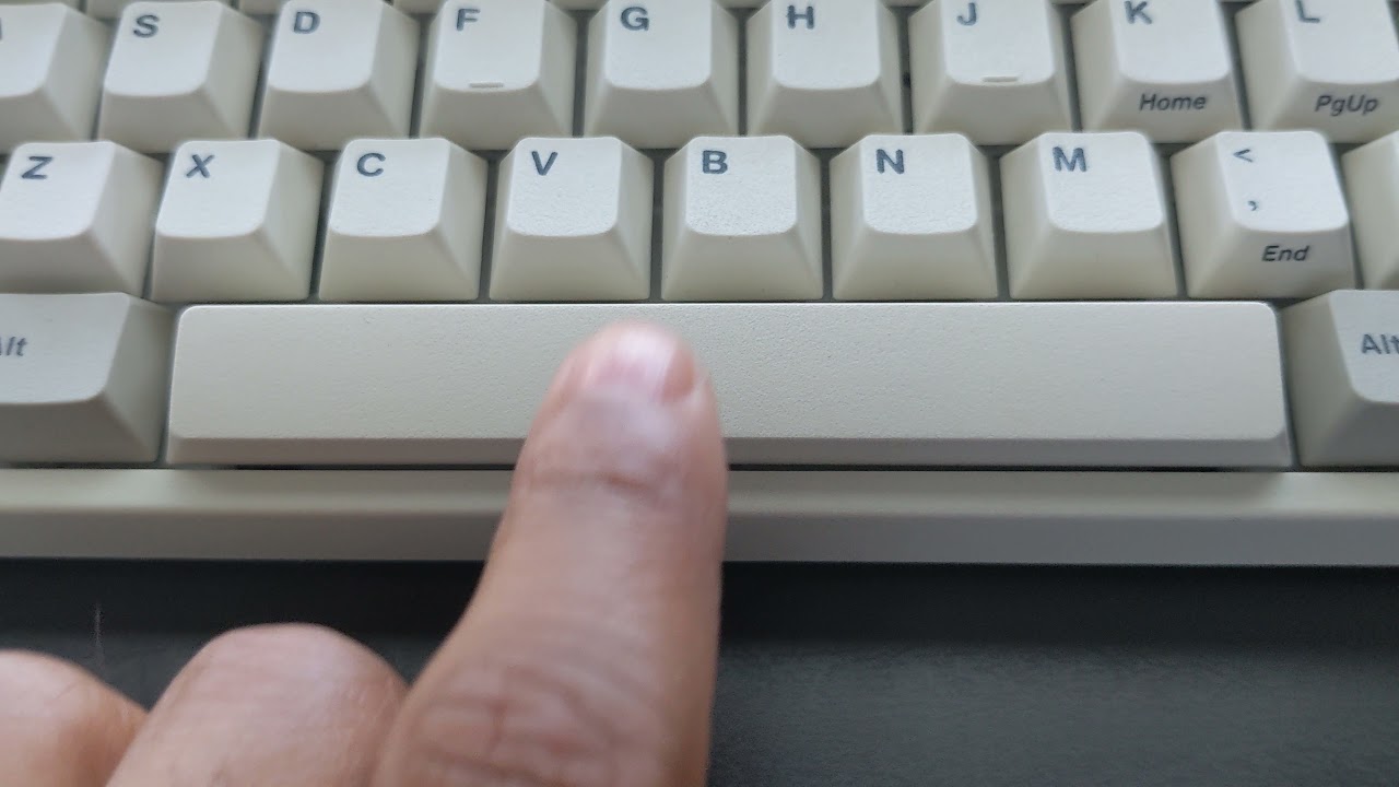 This problem existed with the original switches, Cherry MX Blacks (85g) and persisted after I swapped them for Glorious Pandas (67g). I thought that the problem would go away after I swapped them for a lighter switch. The spacebar is made of PBT at the same thickness and comes in at 7.9g.