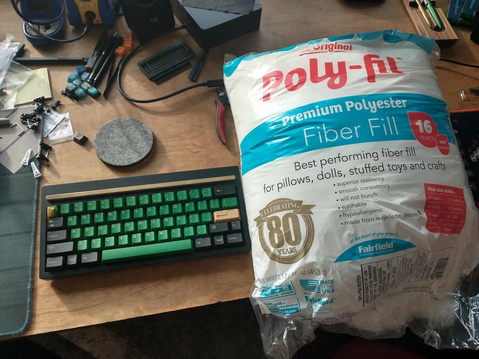 I actually just bought a bag of polyfill to try out in a few boards, here’s a keyboard next to an $8 (16oz) bag for scale: