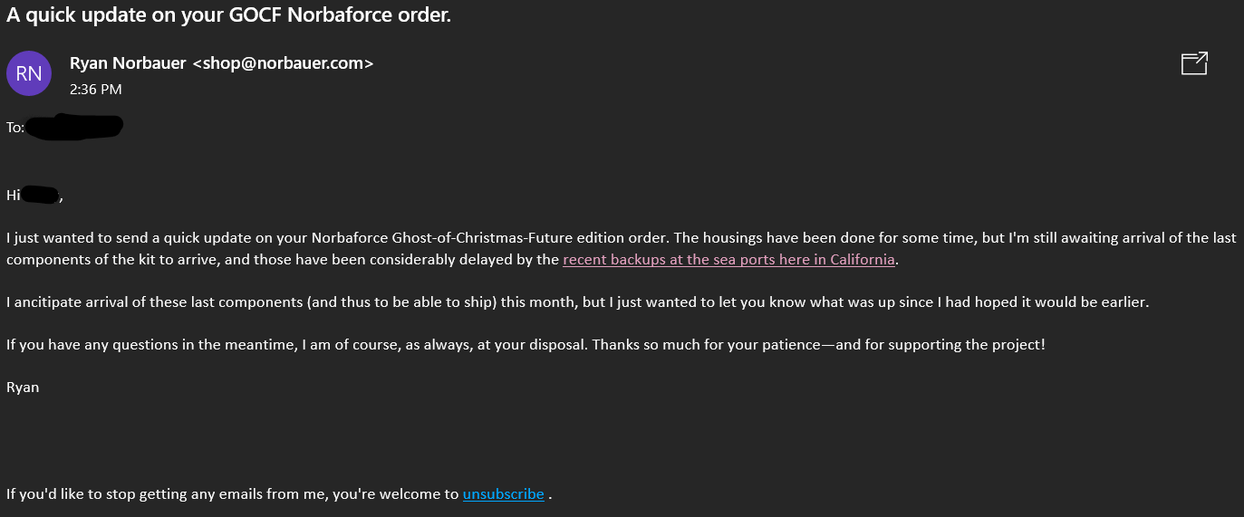 So bummed I couldn’t get in on this, seeing it go to sold out was a feels bad. Oh well, holding out hope that the Norbaforce makes a return this year. I am excited to see all the new polycarb builds from those who joined