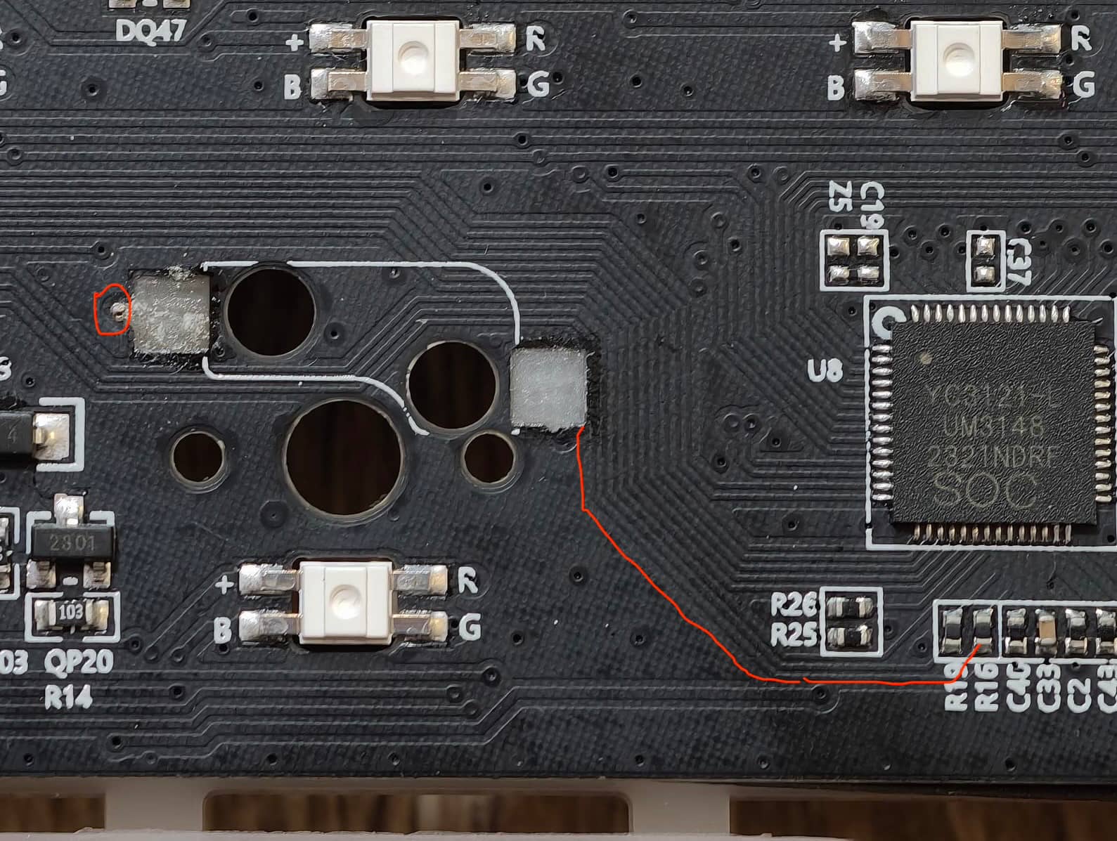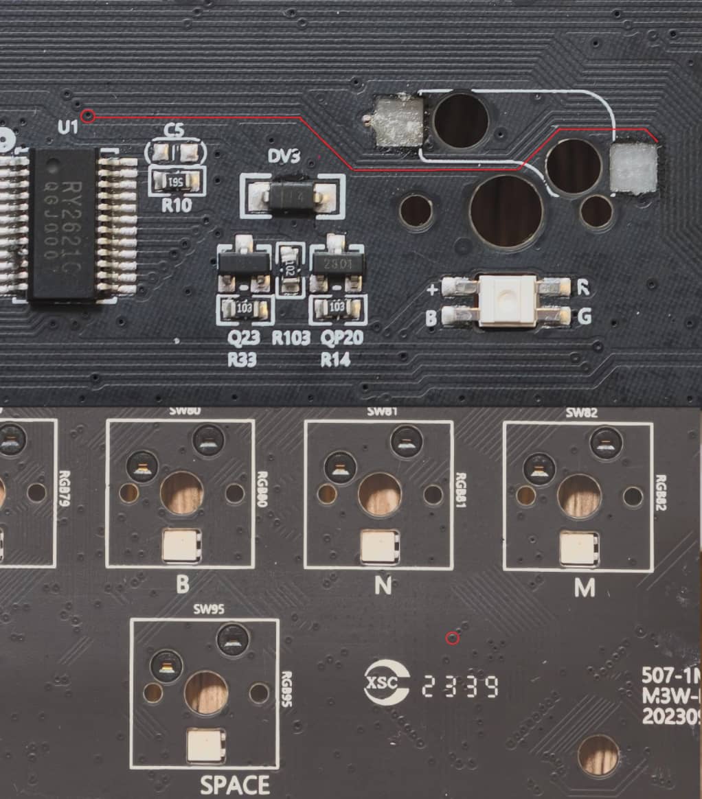 Ahh, I see. Sorry about that. In looking, Iâm not quite sure. The board doesnât seem to be using a single diode for every key, so it might be doing something with shift registers or other electronics or firmware. I see that trace terminate at a via, but sure enough, I canât trace it on the front-side. You may be stuck either waiting for someone smarter than I am or trying to âblind squirrel method of looking for likely candidates to check. You can also see if Monsgeek might send you a diagram of the matrix, but this oneâs got me flummoxed.