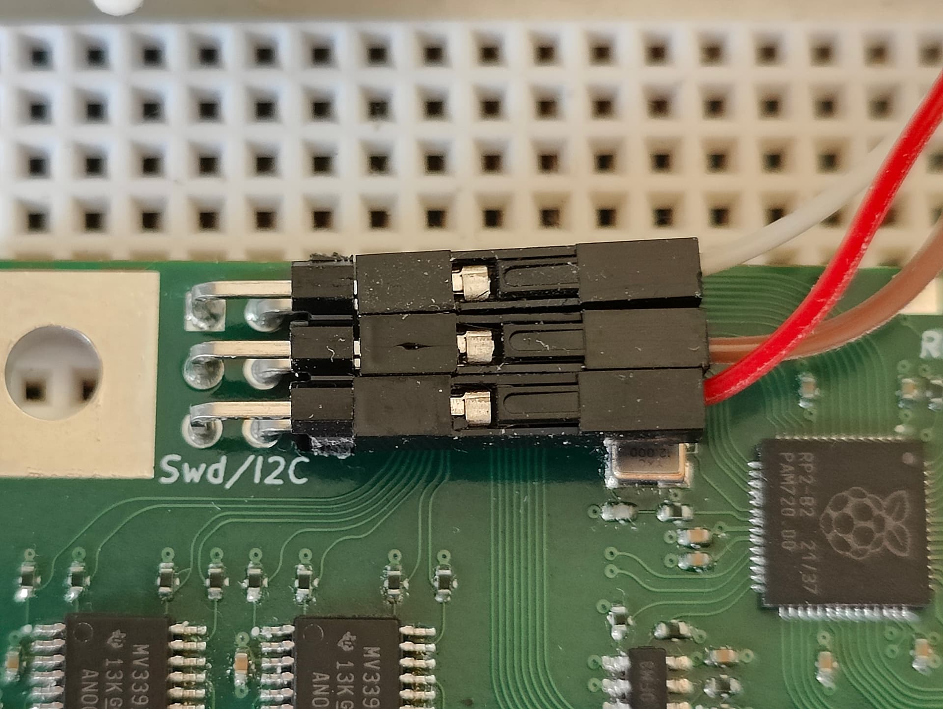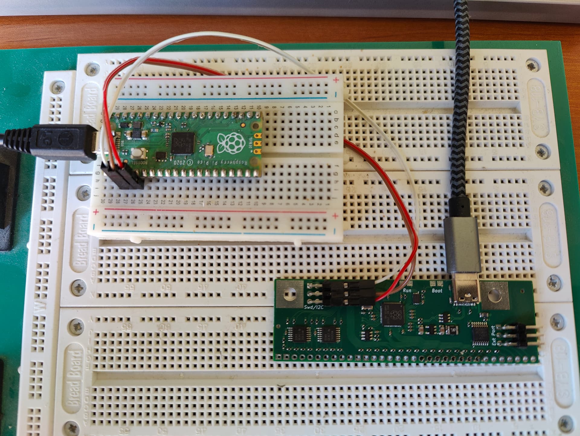 The board on the top left is a standard Raspberry Pi Pico controller, configured as an SDW probe with picoprobe software installed on it.