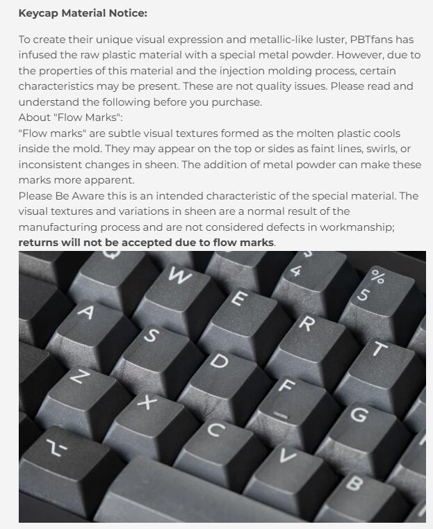 Nah, PBT fans should still be embarrassed. I get that metallic colored plastic will have some flow lines, but it looks like they arenāt even QCing the worst out. The set looks like junk to me as well even knowing it should have some flow lines.
