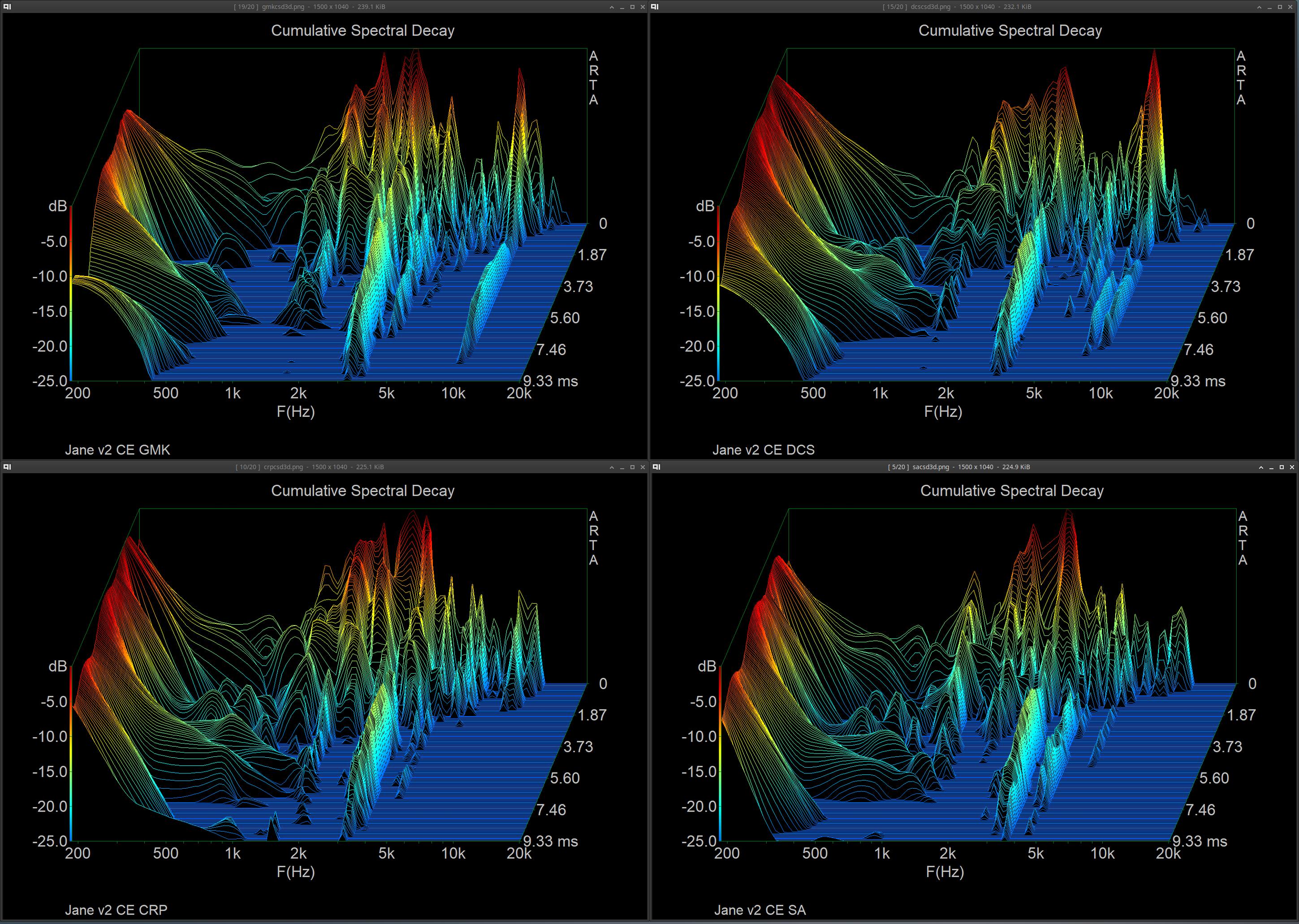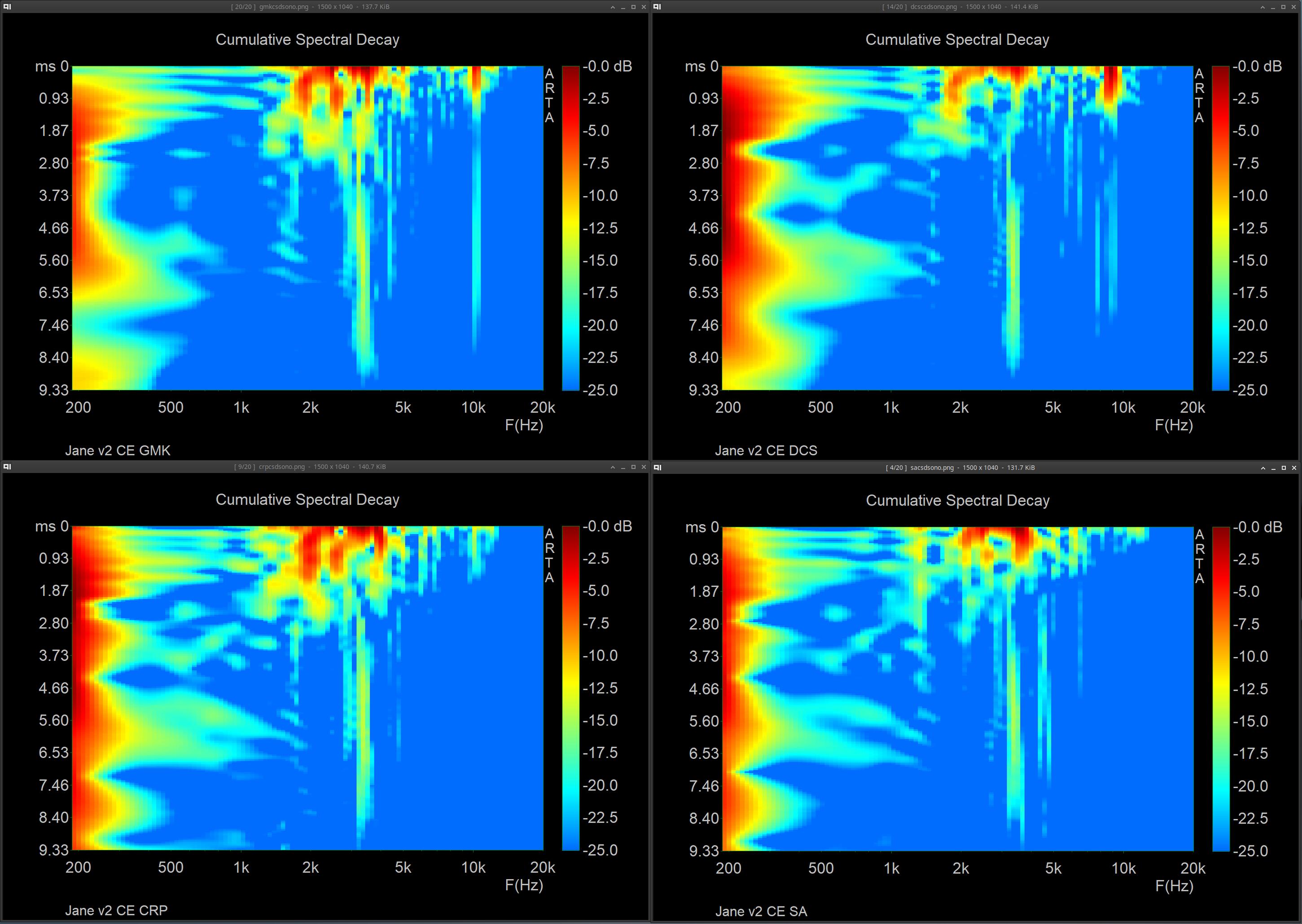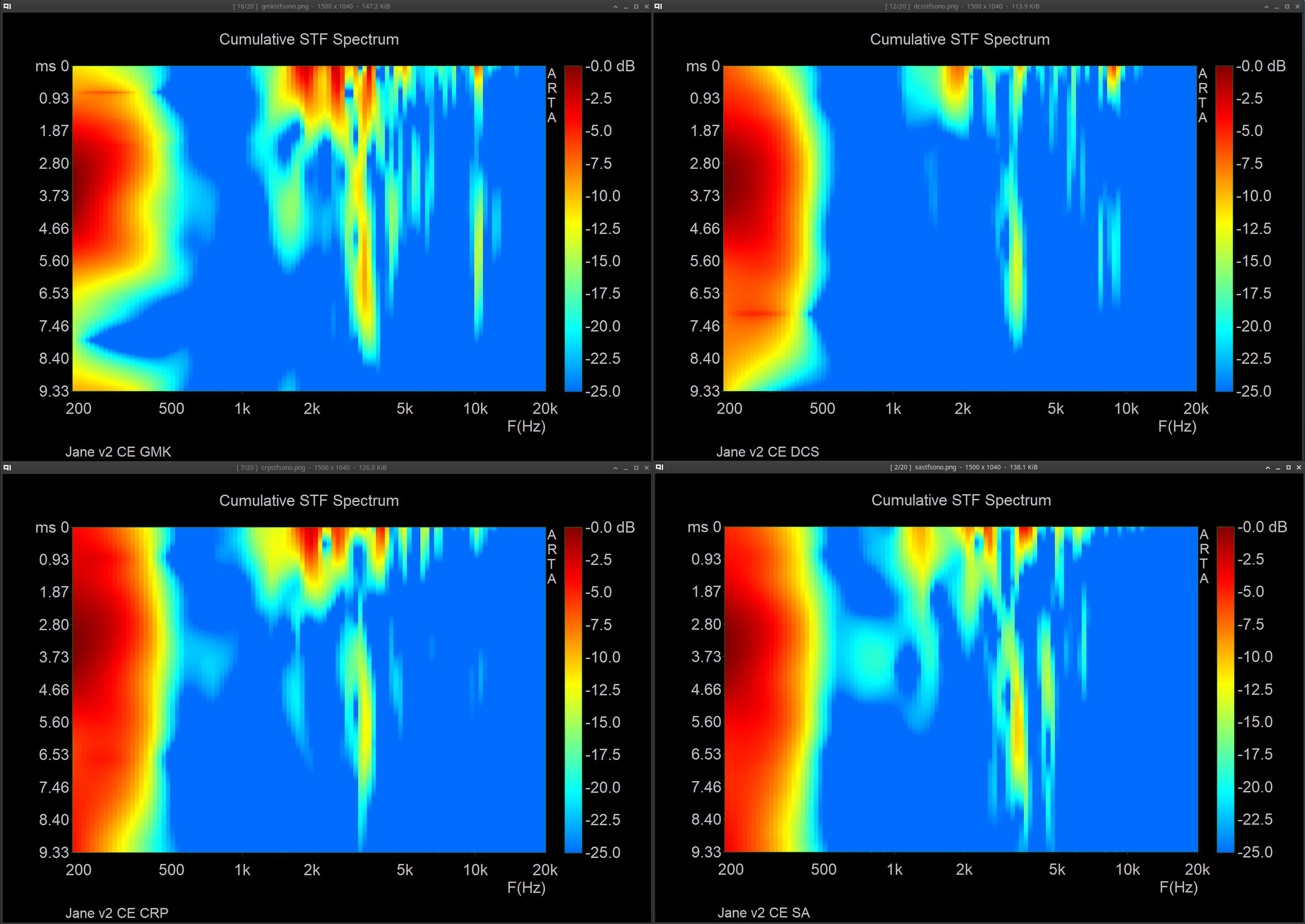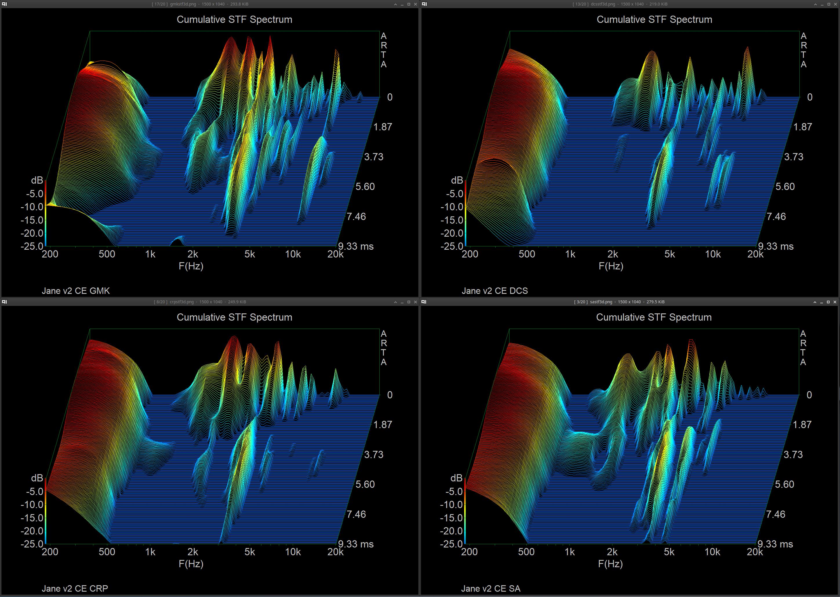 Will stop the spam in this thread after this, and apologies for the bad way to display but it just helps to not have to go though a ton of images lol. Pulled out a more known board (Jane v2 CE with alu plate and mx blacks with sprit slow springs, 205 & 105) and tested GMK CYL, SP DCS, Hammer CRP, SP SA. U87i in omni 15in directly above keyboard, into crane song flamingo → interstellar (24/192), sharply pressing each keycap evenly on the S key, and taking the zero crossing start of the initial sound of the bottom out and starting the measurement there for ~9ms (does not contain sound of return). I found that a FFT of 1024, block shift of 9 samples, and 200 fft blocks was a good balance of resolution in both freq and time. I tested both CSD & STF, along with FR