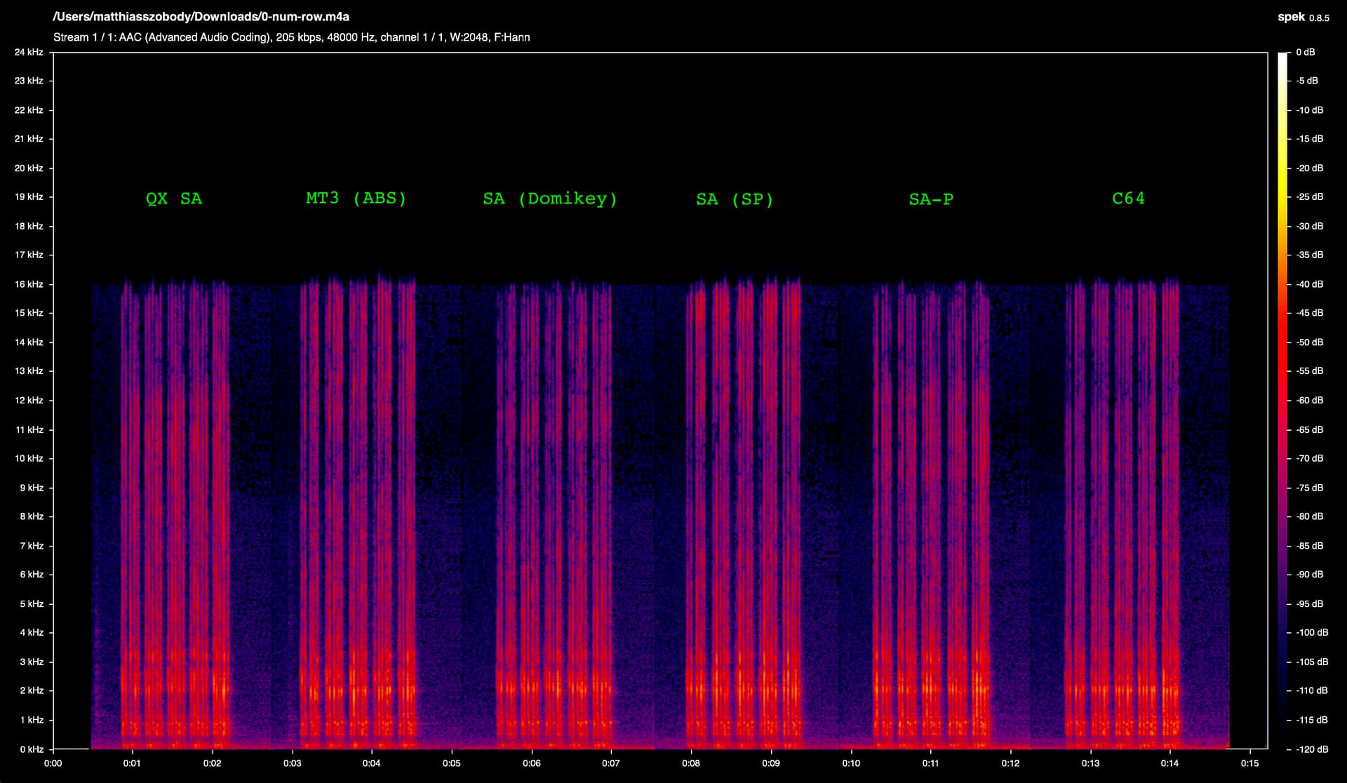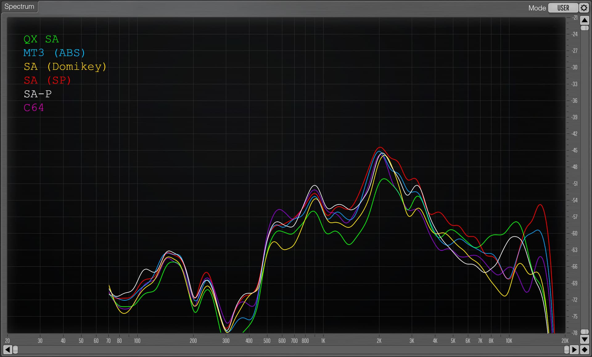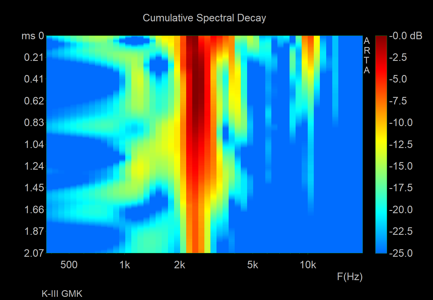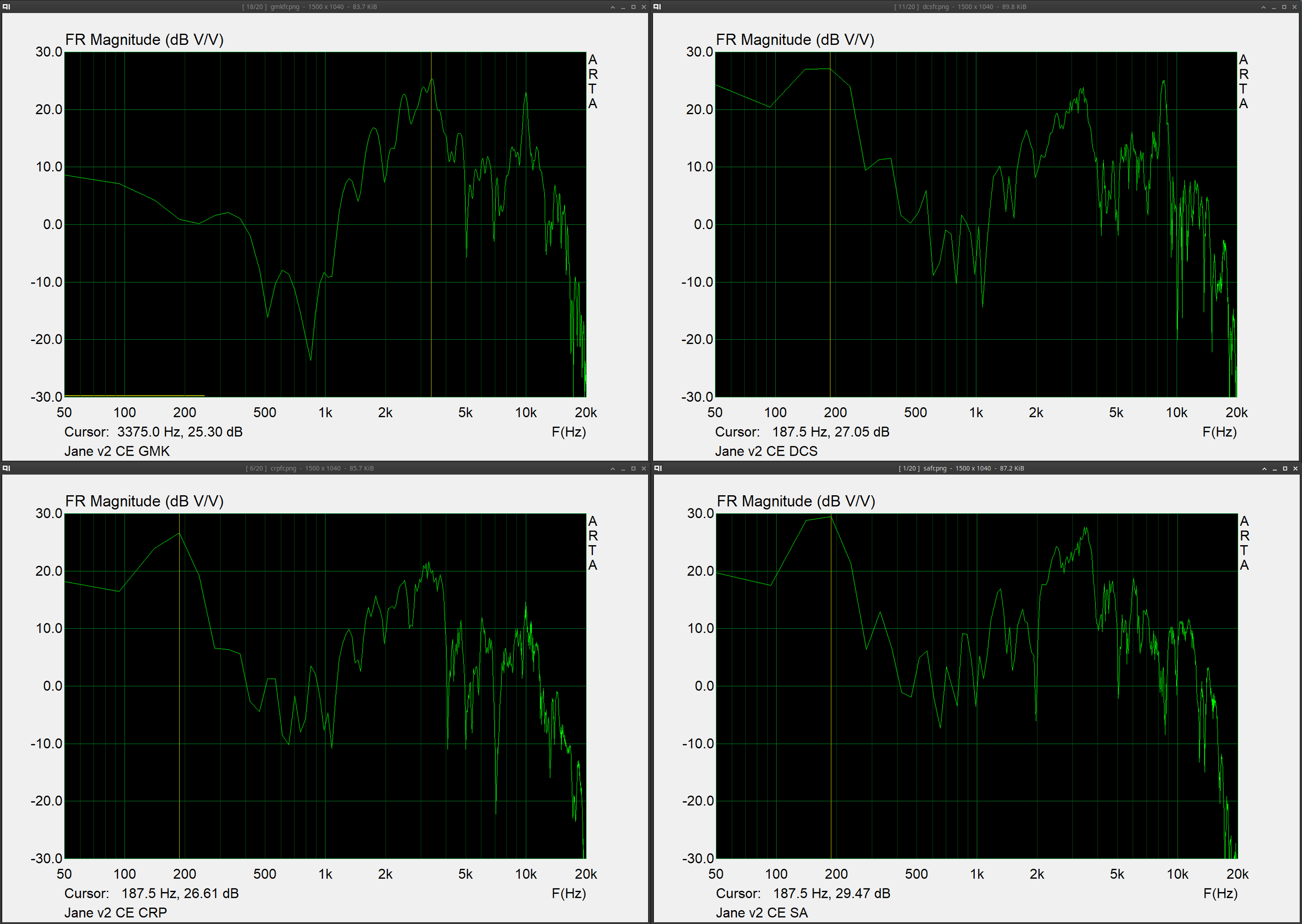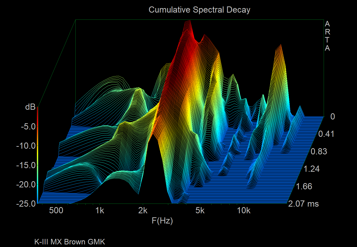 Will stop the spam in this thread after this, and apologies for the bad way to display but it just helps to not have to go though a ton of images lol. Pulled out a more known board (Jane v2 CE with alu plate and mx blacks with sprit slow springs, 205 & 105) and tested GMK CYL, SP DCS, Hammer CRP, SP SA. U87i in omni 15in directly above keyboard, into crane song flamingo → interstellar (24/192), sharply pressing each keycap evenly on the S key, and taking the zero crossing start of the initial sound of the bottom out and starting the measurement there for ~9ms (does not contain sound of return). I found that a FFT of 1024, block shift of 9 samples, and 200 fft blocks was a good balance of resolution in both freq and time. I tested both CSD & STF, along with FR