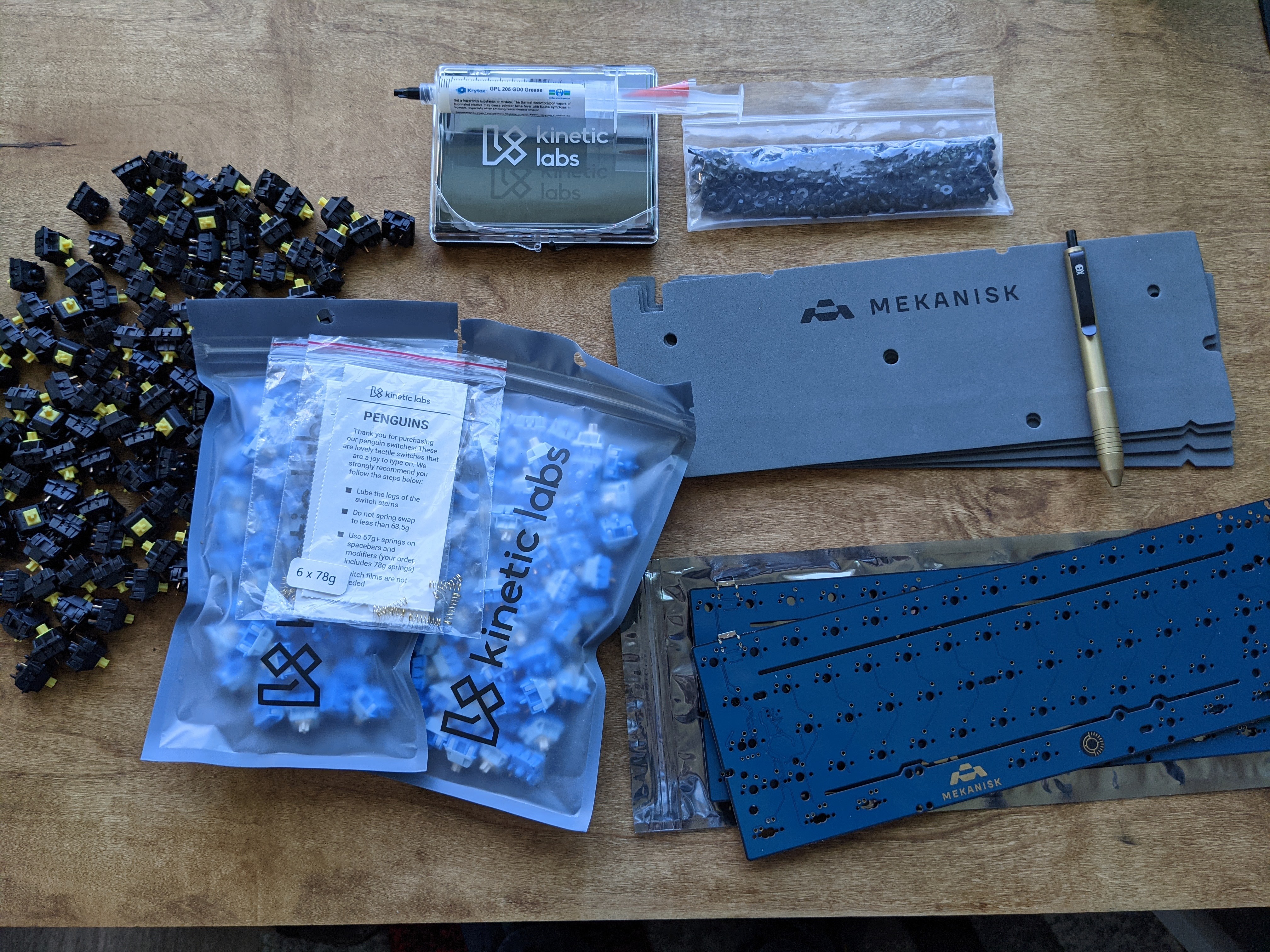 A couple of WT60-Ds and case foams from mekanisk; gateron yellows, penguins, and 205g0 from kinetic labs; and a bunch of replacement hardware for my sirius.