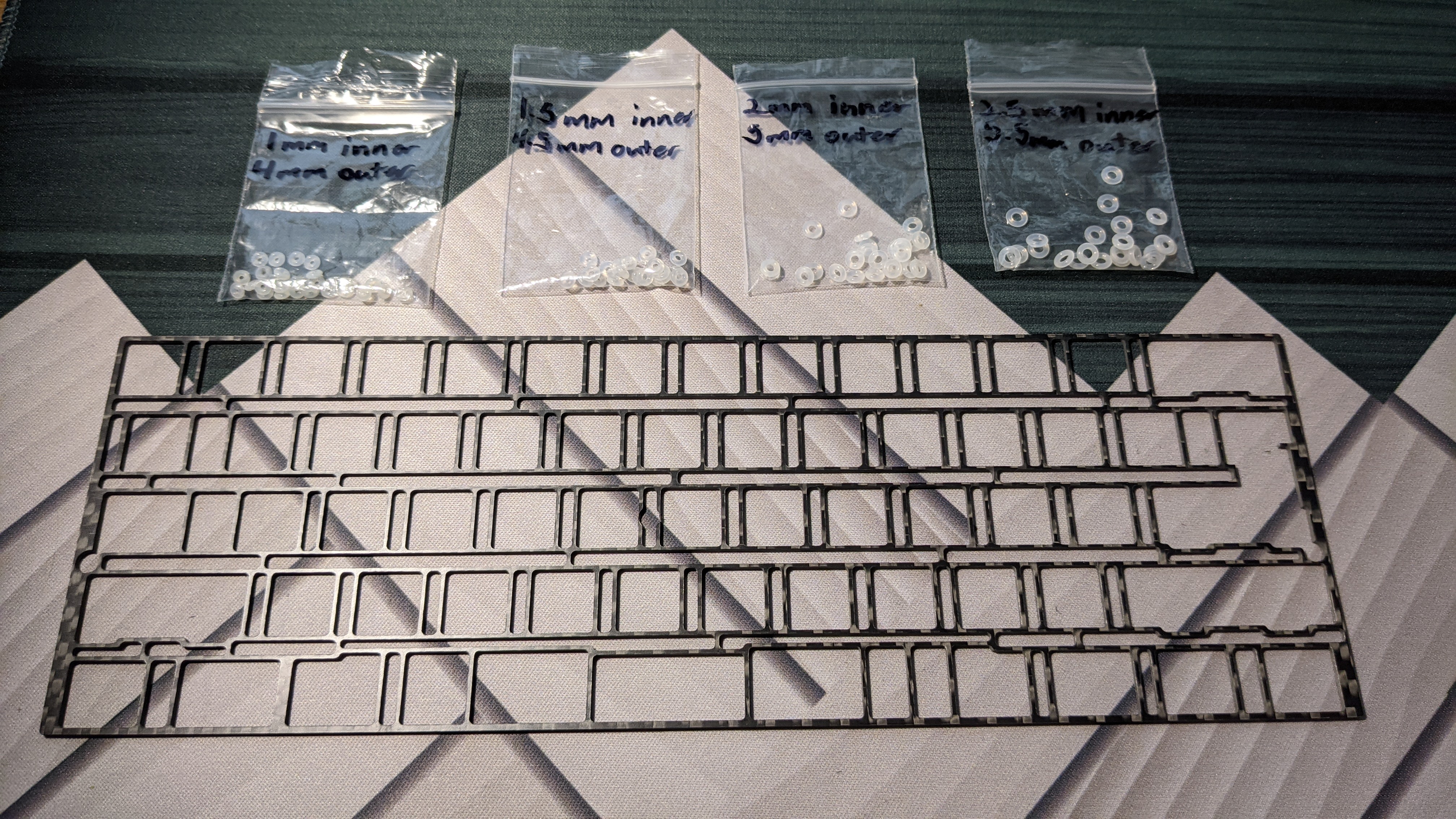 I got more parts for the 5 degree flex mod I’m working on. Multiple sizes of silicon O-rings for a little experimentation and a carbon fiber plate from kbdfans.