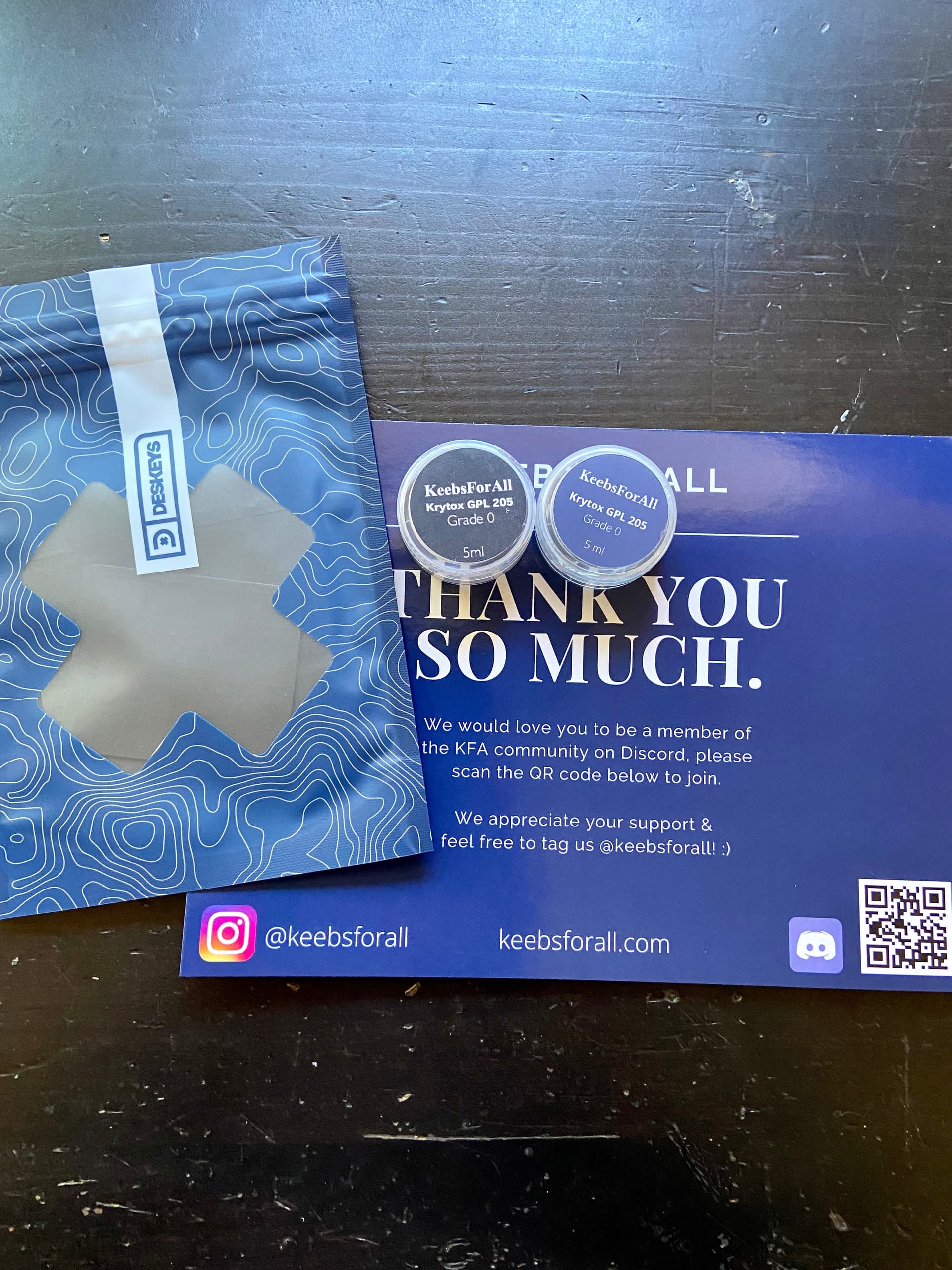 Good ol’ 205g0 from KeebsForAll, as with some Deskeys films. I mainly go to them for stuff because of the free and fast shipping but 2 weeks to get here… Took long enough