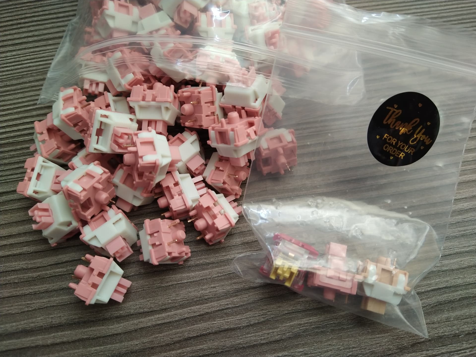 Surprised by the fast shipping, but i got my Outemu cream pink. They also put in a sample of the red panda, milk peach linear and the new cream yellow silent tactile.