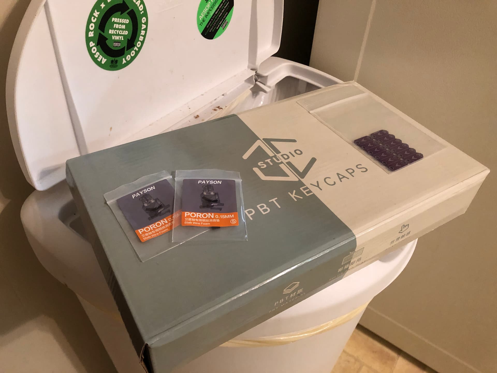 Some shims, pads, and Heeb-keys* from PovertyKeys; photographed atop the waste bin in honor of their trash panda mascot.