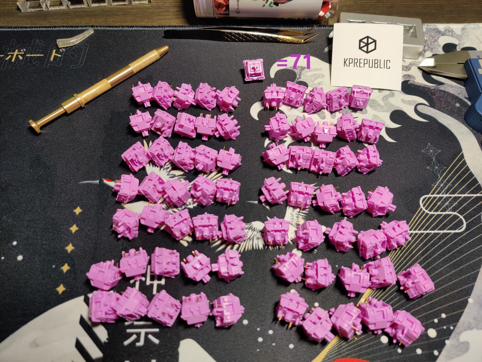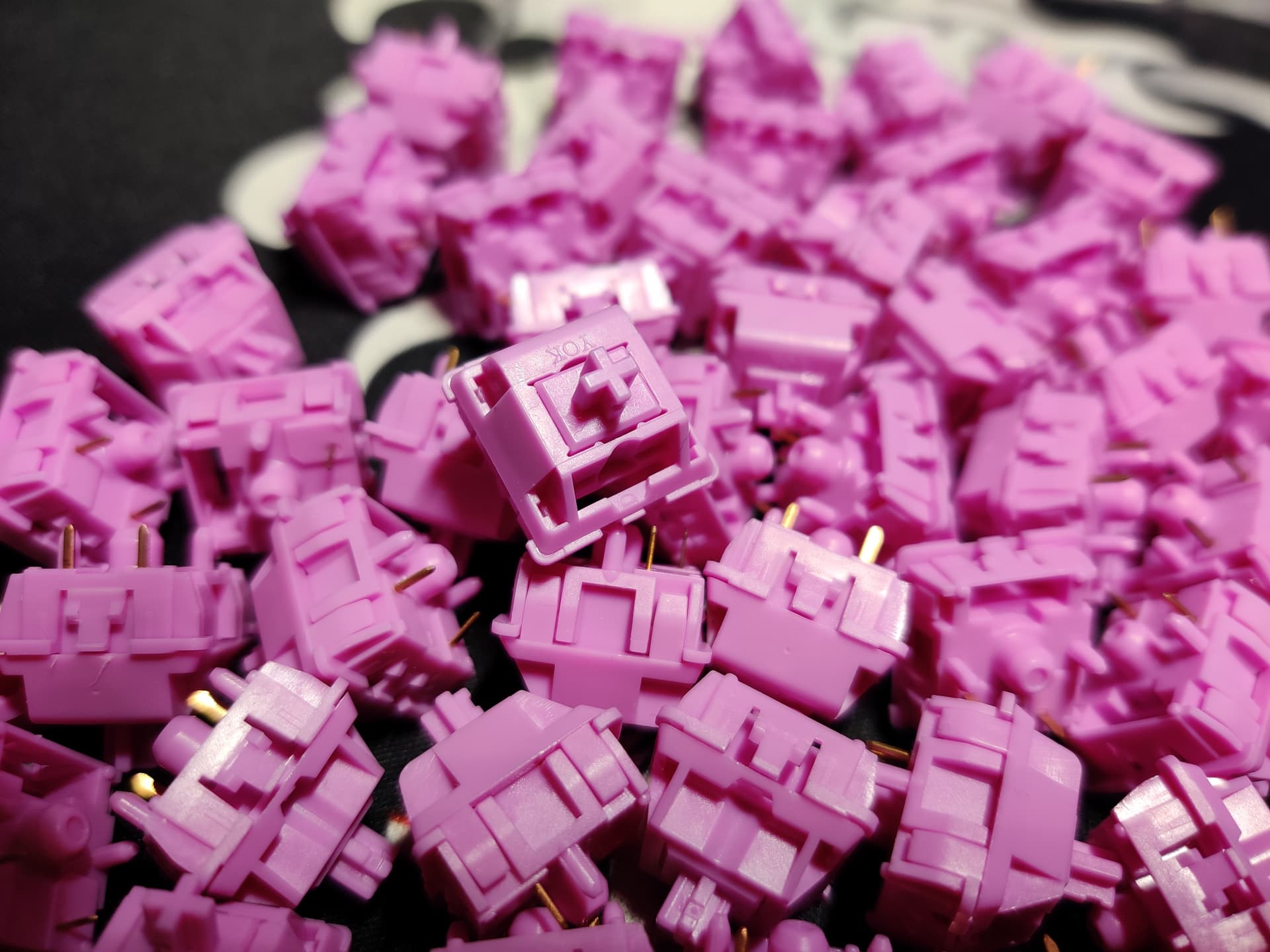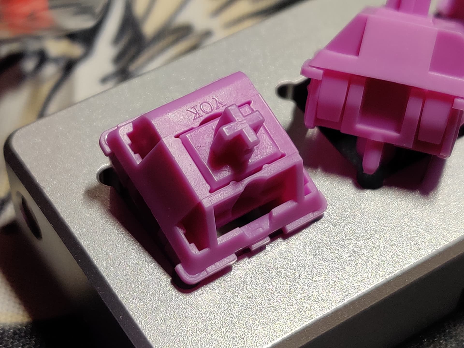 - QK01 switches, Manufacturer either Duhuk (formerly lumia) or GrainGold, depending on the listing and who you ask. Another POM long pole stem, PC top, Nylon bottom combo with some additives thrown in here and there. These are quite exceptional though, imo. Almost no wobble, very smooth and the sound is also quite nice. I also have a soft-spot for fully black switches.