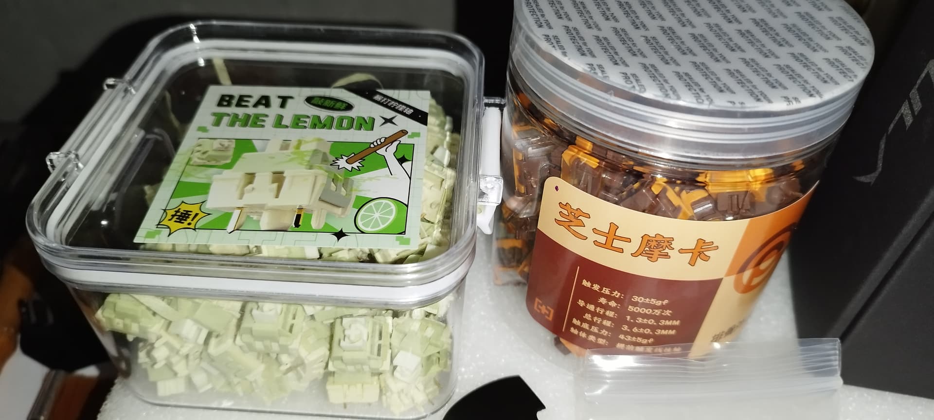 - Aiguox “beat the lemon” switches. POM stem, PA6 top, PA66 bottom, so basically just a mixed Nylon housing, nice. it’s a linear switch with a 22m long 40g spring with 3.5mm travel. I’m not sure about the manufacturer, but it’s awfully close to the “Bald Brother Strawberry Ice Cream V3” i showed before… sadly i don’t know the manufacturer of those either. But they are quite smooth and the springs seem to be quite decent as most of them don’t have any ping, with some only having a very subtle one.