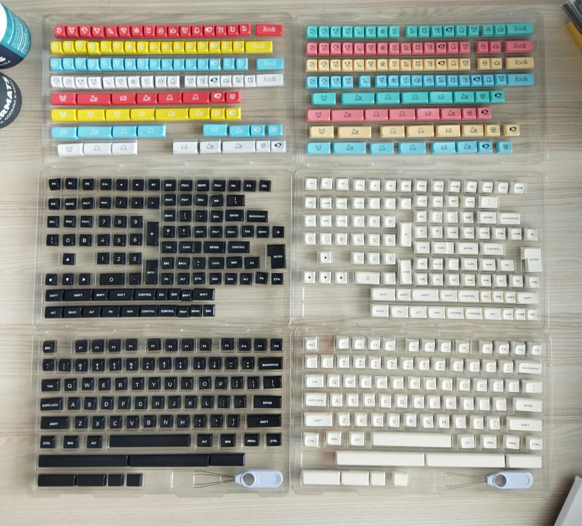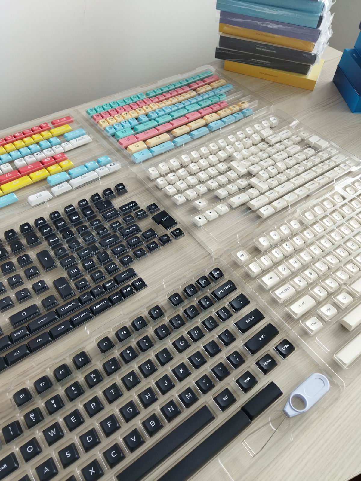 I needed some variety in keycaps and found these huge but affordable MDA sets by Akko. The white and black sets, double-shot btw, have 564 caps altogether.