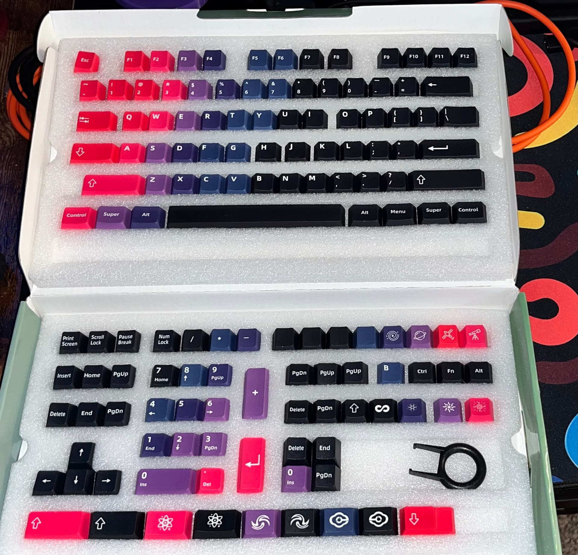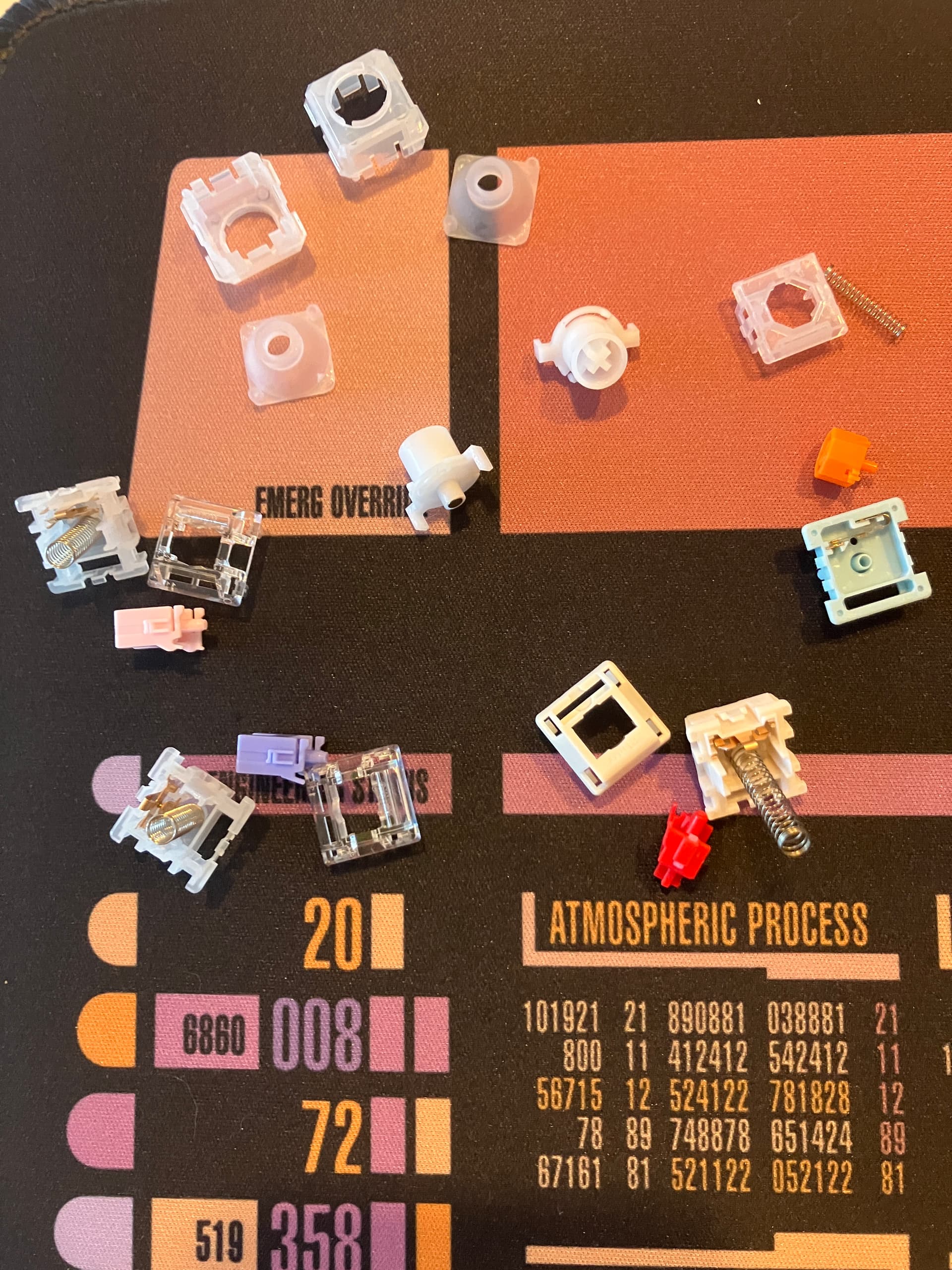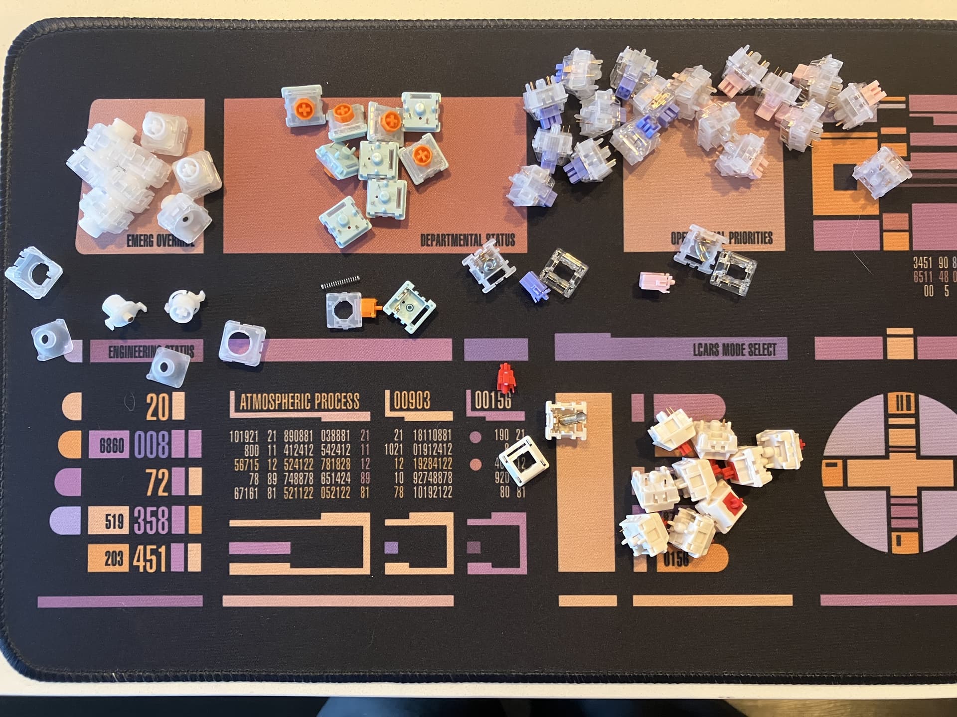 Got some new Haimu (and one HMX) switches in from Aliexpress. Also my first deskmat because I apparently couldn’t help myself with a TNG LCARS theme (they also have TOS and the Stargazer from Picard).