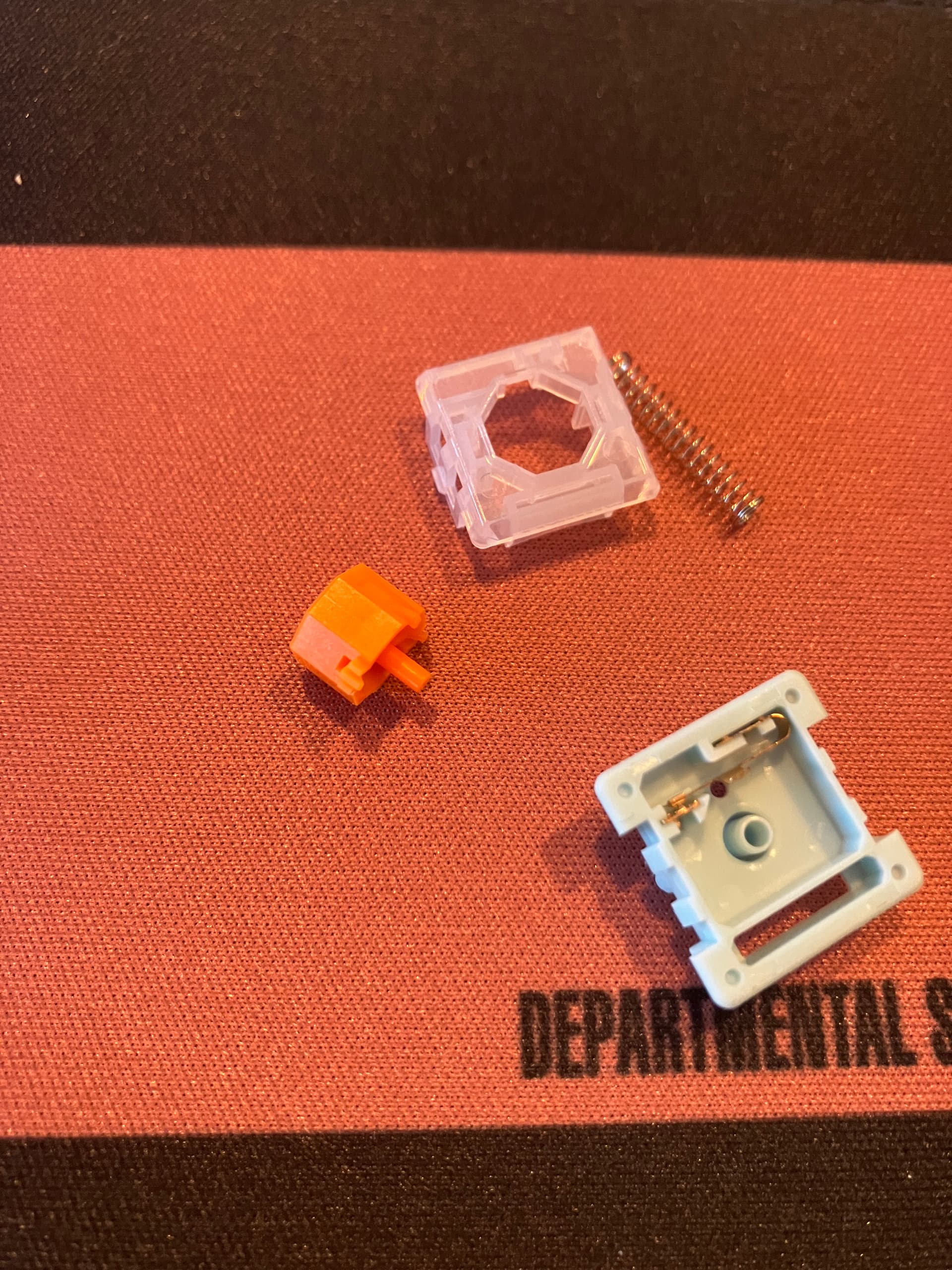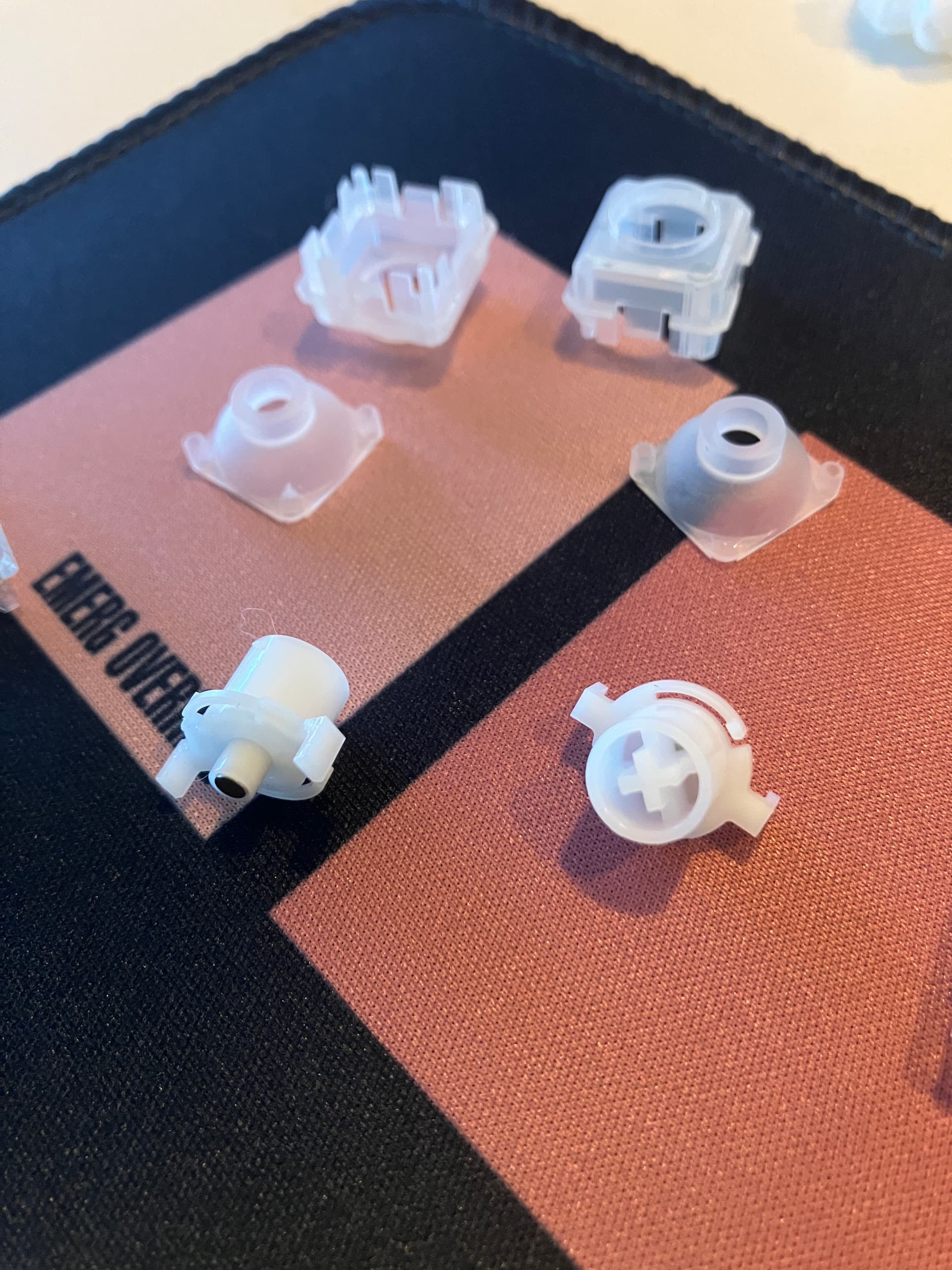 The HMX is a fairly standard silent linear from HMX (silicone on the stem rails), while the Blue and Pink Haimu switches use the same silence tech they’ve been using (plastic flanges on the stems). In fact, all the silencing with these Haimu switches is done with those plastic flanges. But the last two get…weird. Or at least not things I’ve seen before.