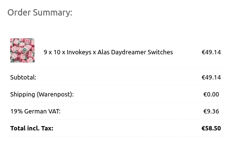 In fact, it now turned out to be a double win: free shipping and 19% German value added tax (VAT) instead of 21% Belgian VAT. Smuggling switches is fun!
