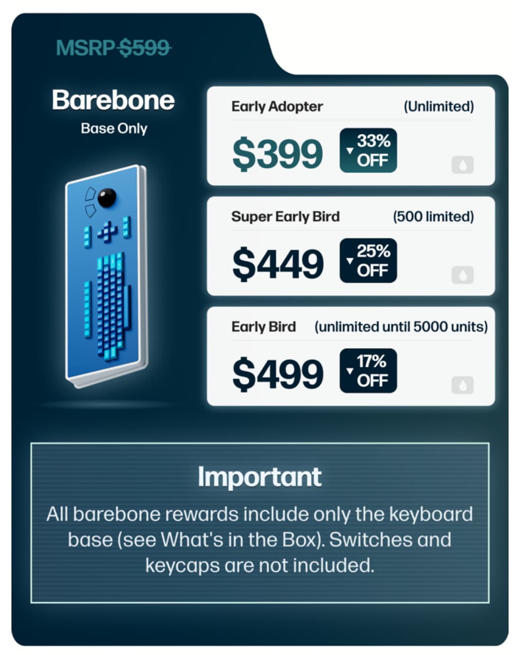 I backed it as an early adopter earlier in the year, which is nice(r) for the wallet, but they’re still just killing me: the Dasher layout, by far the most desirable IMO, is not included in the $200 cheaper Barebone configuration! What!