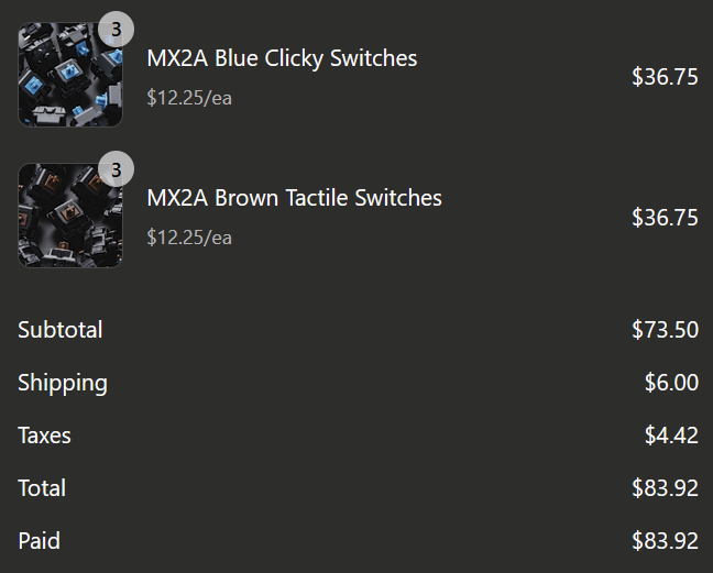 I’m tapped out for a bit now, but picked up some more MX2A switches. Already have MX2A orange but wanted to add browns and blues to my collection: