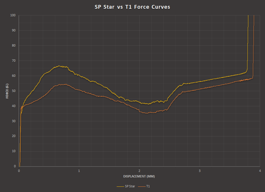 I recently got some of the SP Star switches and compared them to T1, generating force curves for both: