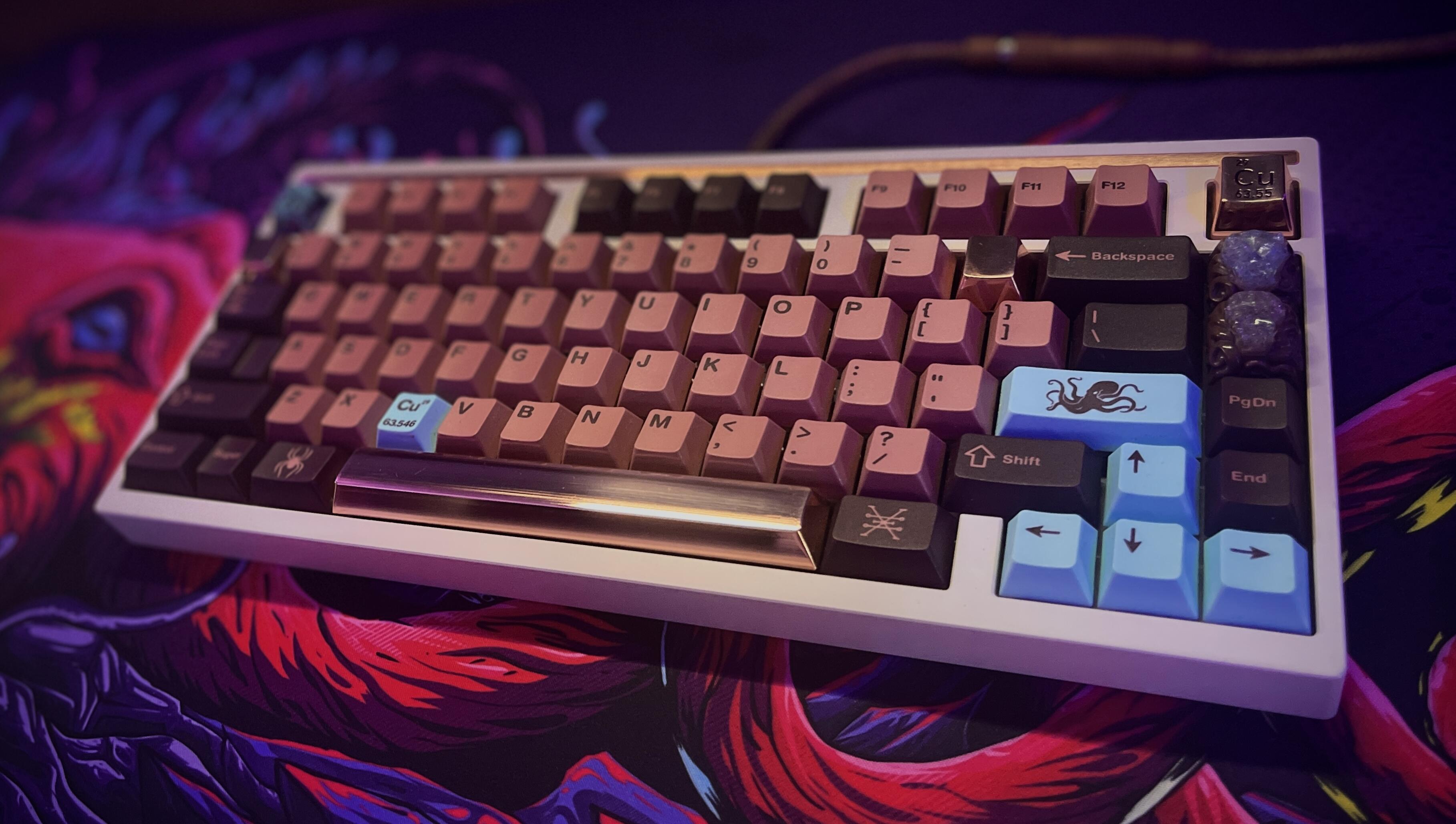 The purple and pink gradient keycaps you “have” is GPBT Nebula from Glorious, and the black and gold clear keycaps are from Akko’s ASA lineup. The purple and pink keycaps are cherry profile but the clear ones are not.