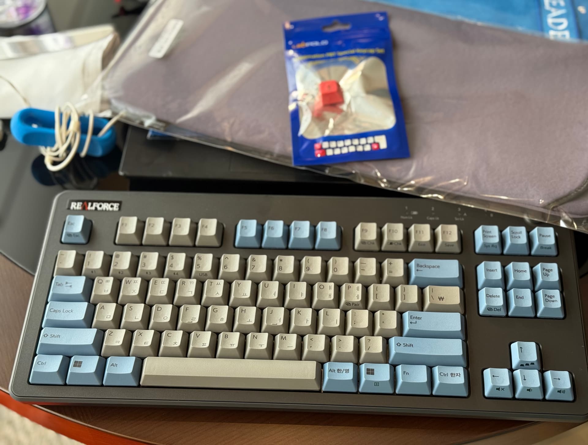 Hello from Seoul, everybody. We went through Yongsai a little bit today, and made a stop at both Funkeys and Leaderskey. It was at Leaderskey where I decided not to be quixotic trying to find a great deal on an FC980c, but instead to get something that could be a good memory of this trip. To that end, I grabbed an R3 TKL 45g as my first Topre board. Nothing special price-wise, though in line with US vendors, and I got the version with gray and blue caps with Hangul sublegends. In my heart of hearts, I wish they made a 50g, but the 45 felt just a bit closer to my ideal than the super-aggressive 55g, and I”m not entirely sure they had anything other than the tester in 55g anyway. Very easy experience, even with a language barrier and my slightly bored 12-year-old, and they threw in probably $20-$25 worth of accessories gratis, including one of their Made-in-Korea neoprene pouches.