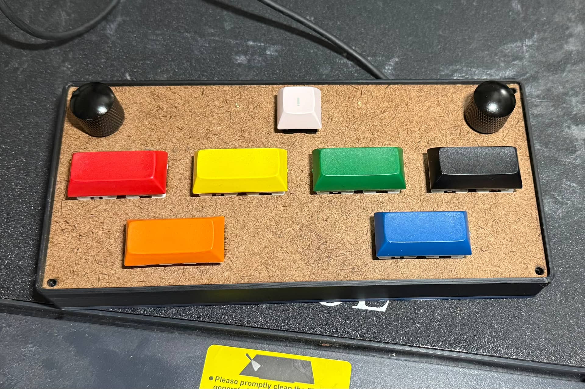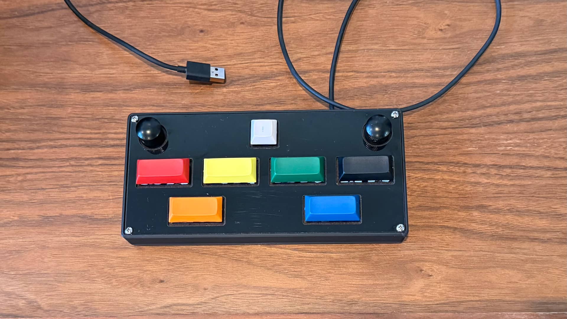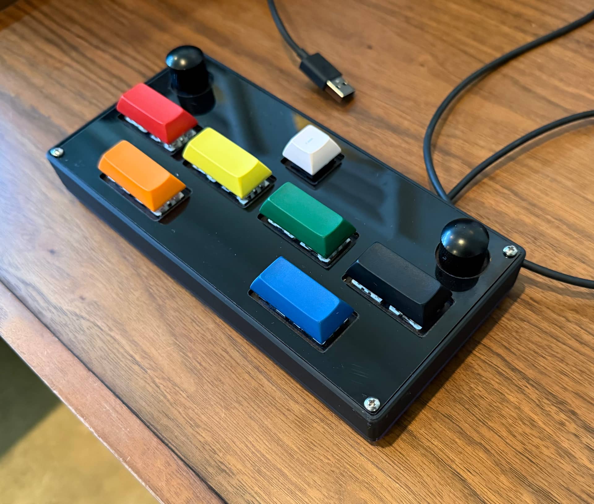 I guess technically this could be considered a macropad. I got a couple of no-detent encoders for a buck each when I ordered my Astrodomes, and I used them with some spare parts to make my kiddo a controller for “Sound Voltex” style rhythm games.